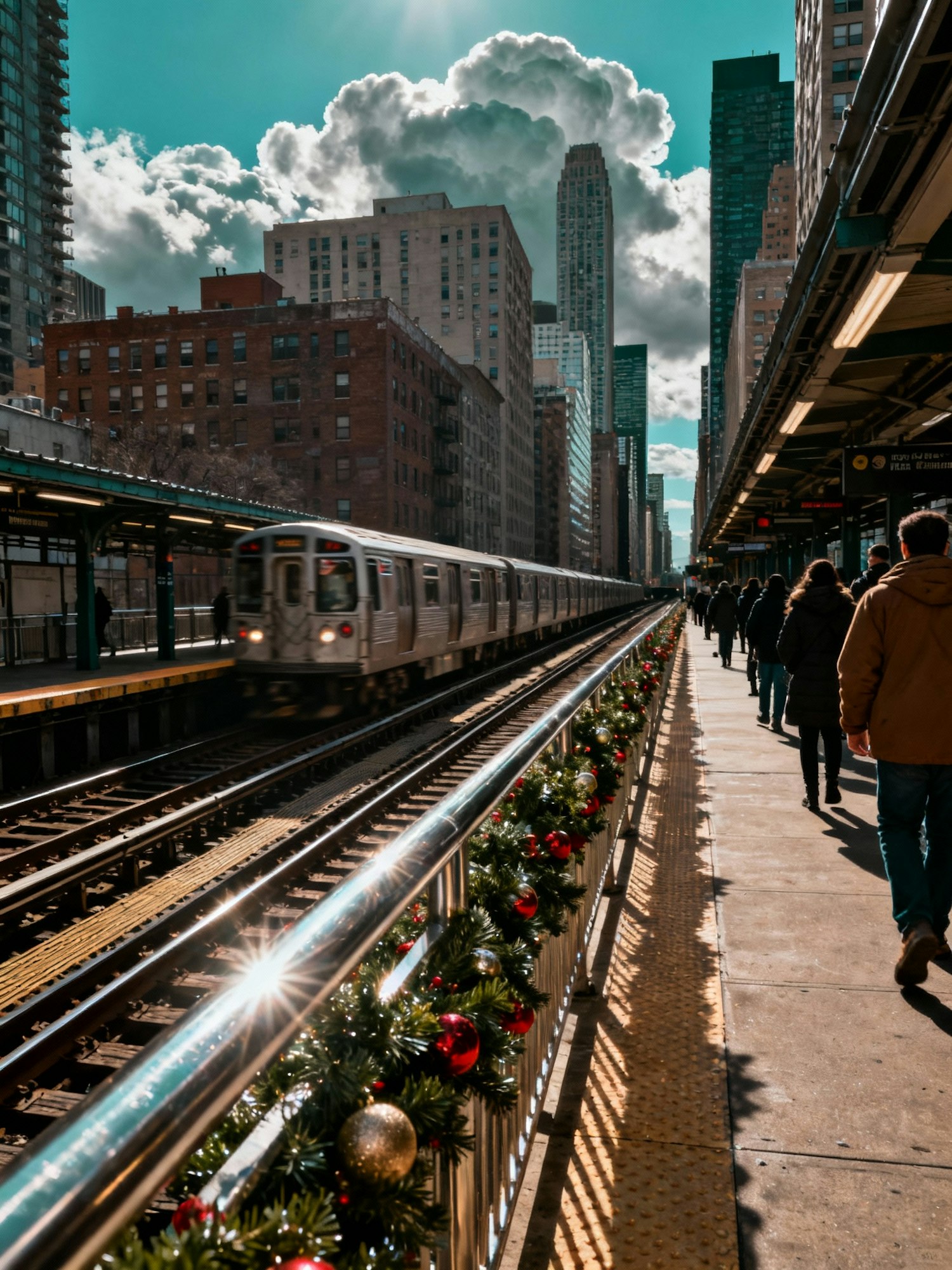 Elevated rail station platform Holiday garland along the guardrail; train enters with realistic motion blur at wheels only; commuters in coats, natural skin tones; city canyon and towering cumulus behind the tracks; sun break glints on stainless handrails. 24 mm, f/7.1, ISO 100, 1/250 s; CPL. Negative: bendy tracks, duplicated faces, teal-orange grading.