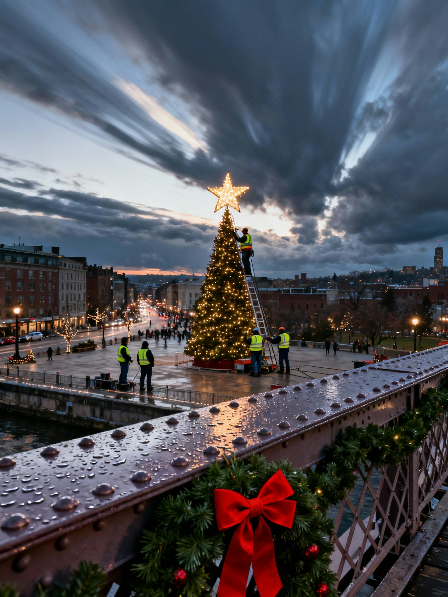 Bridge overlook + city tree switch-on prep Technicians adjusting a star on a massive tree in the square below; wet rivets on bridge rail, wreath with red bow in foreground; dramatic sky break and long city view; realistic DOF at 24 mm (nothing oddly blurred). 24 mm, f/7.1, ISO 100, 1/250 s; CPL. Negative: fisheye distortion, fake anamorphic flares, edge halos.