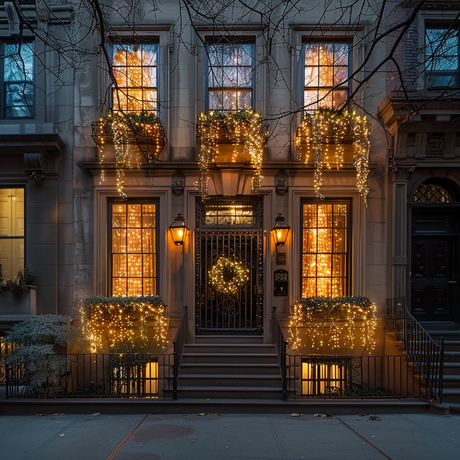 Festive townhouse with golden holiday lights, wreath, and classic lanterns creating a warm, inviting winter atmosphere.