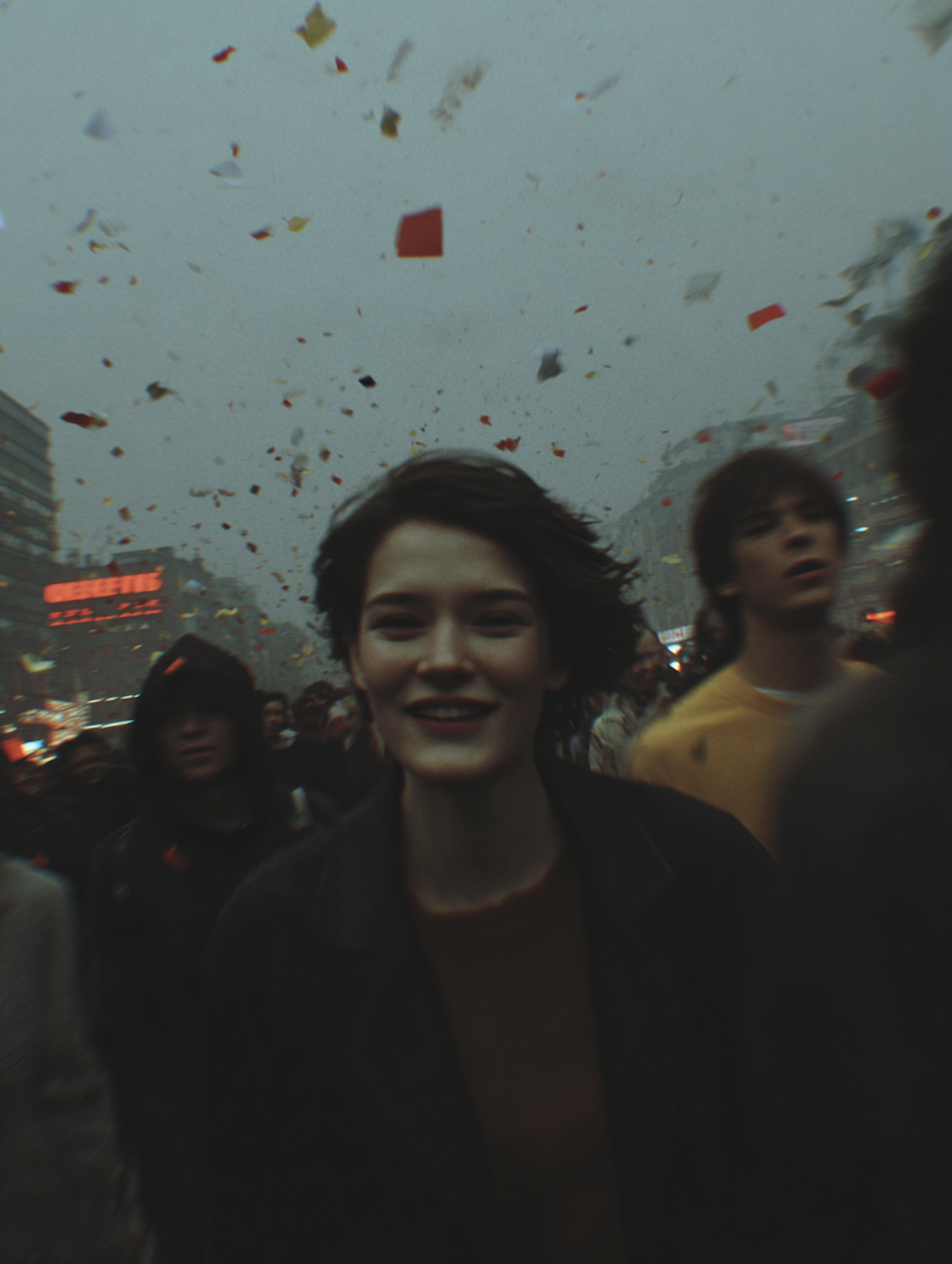 A young woman smiles amidst a lively crowd under a confetti-filled sky, capturing a moment of celebration in an urban setting.