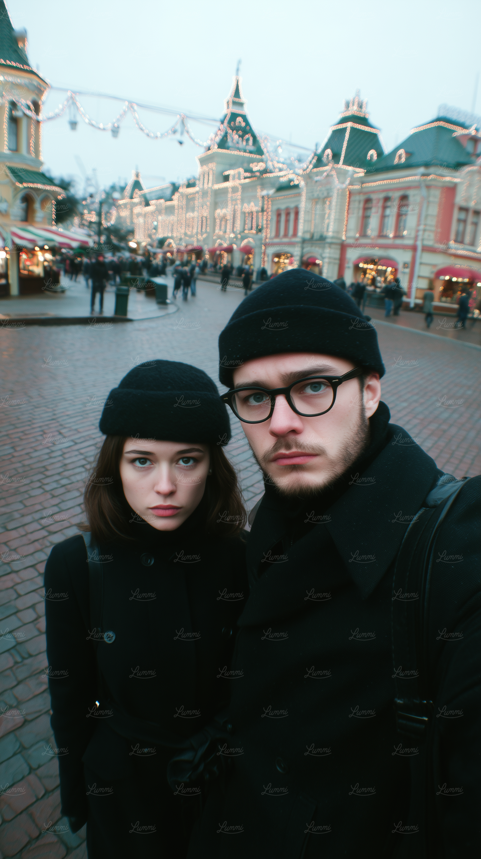 A man and woman in black coats and hats pose in a festive, light-adorned city street with cobblestones and holiday decorations.