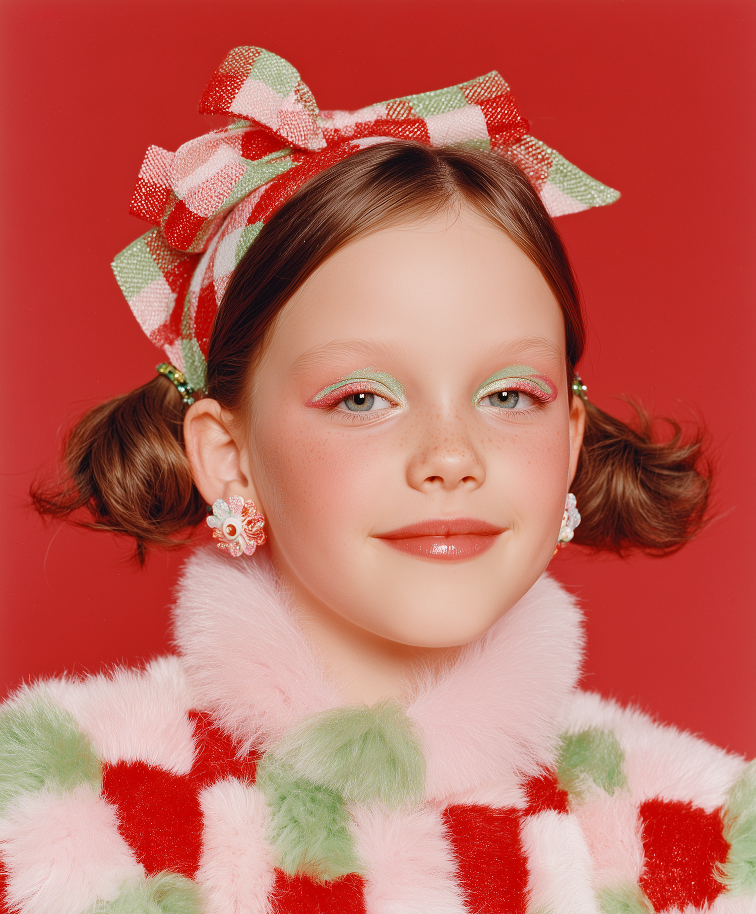 A cheerful portrait of a young individual in a festive outfit with colorful makeup and accessories, set against a vibrant red background.