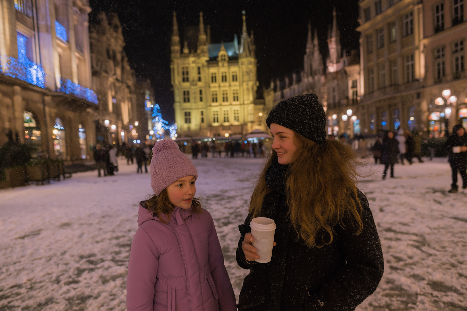 Two warmly dressed individuals are enjoying a snowy city square at night during a Christmas market, surrounded by festive lights, historical buildings, and a cheerful ambiance.