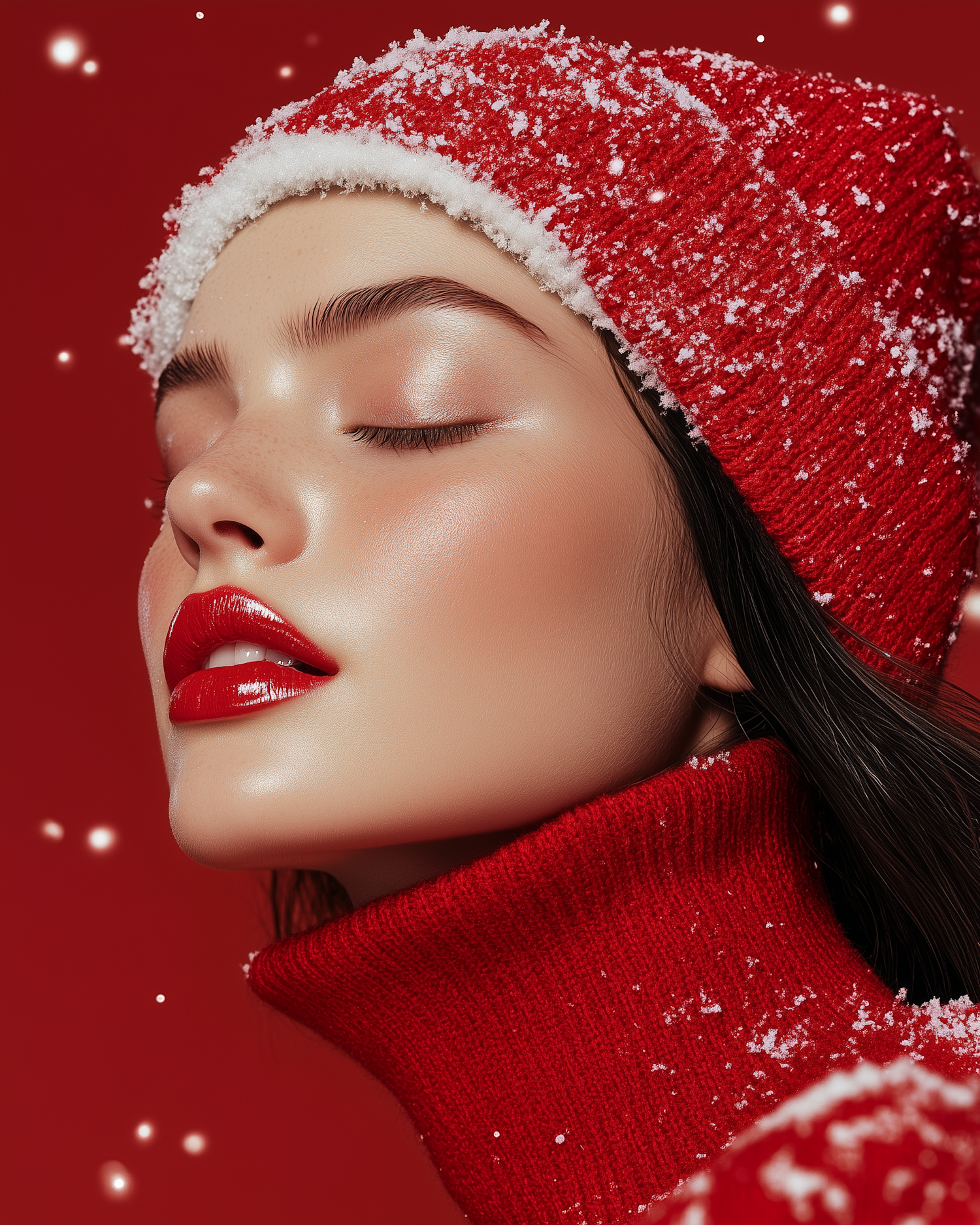 Close-up of a woman in red winter attire with snowflakes, exuding a festive and serene vibe against a red background.