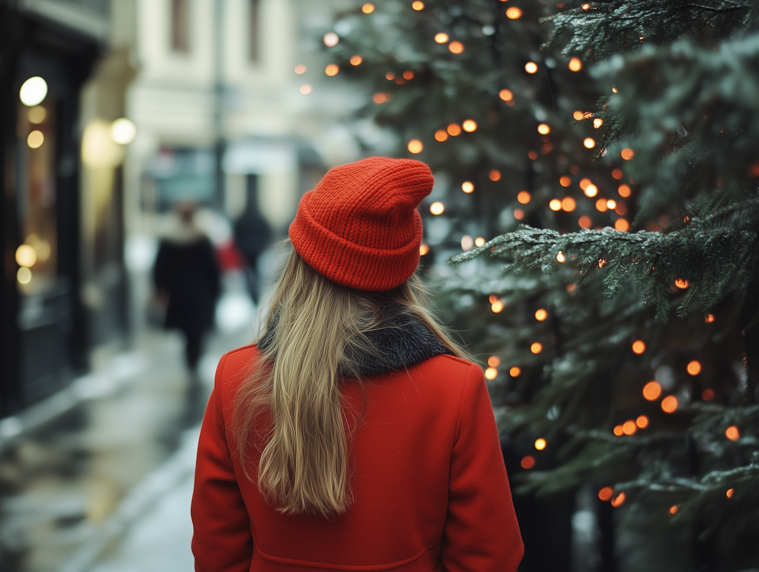 Woman in red coat and hat admires a lit Christmas tree on a snowy city street, creating a festive winter scene.