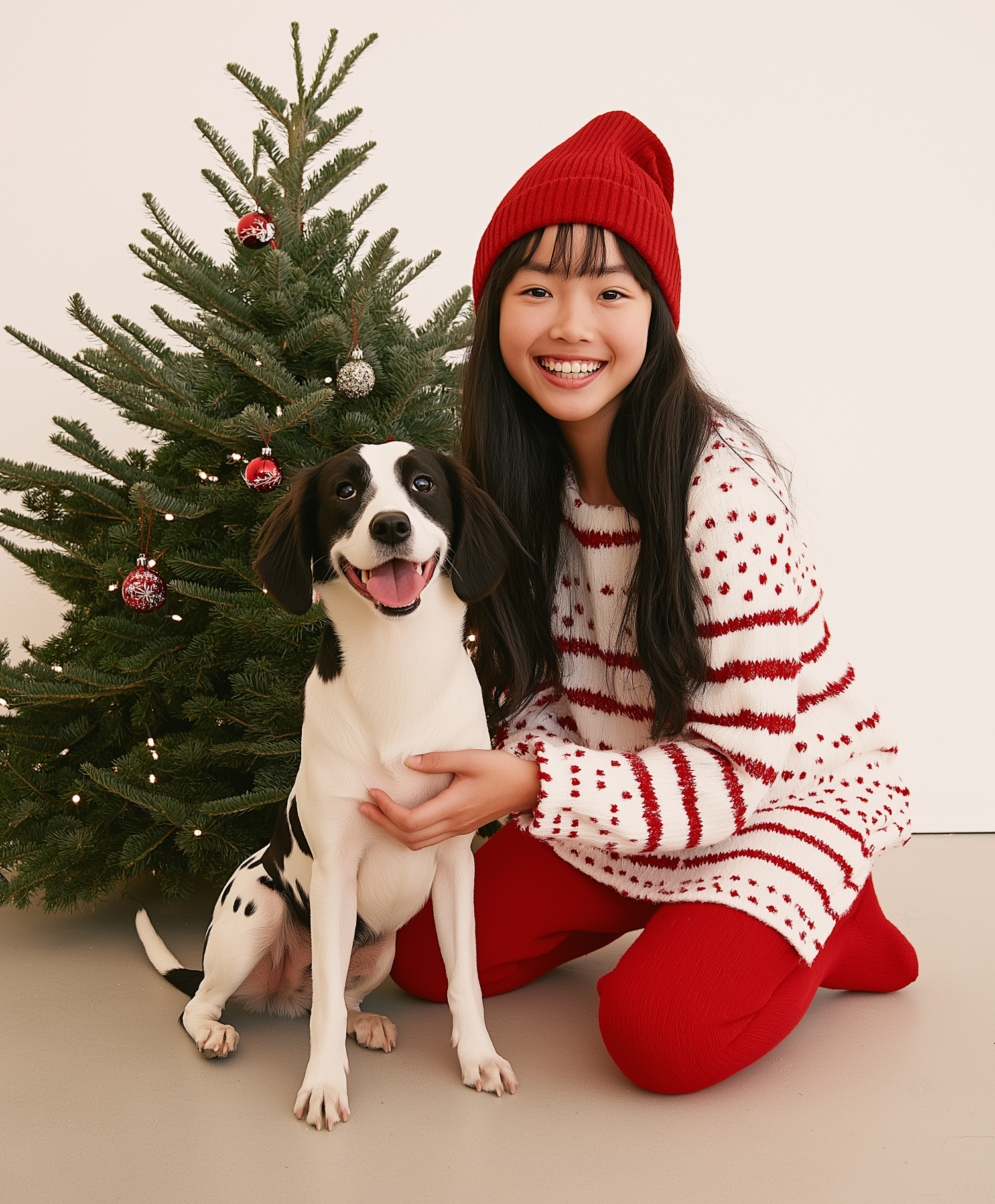 Asian girl in festive attire with a black and white dog by a decorated Christmas tree, exuding holiday cheer.