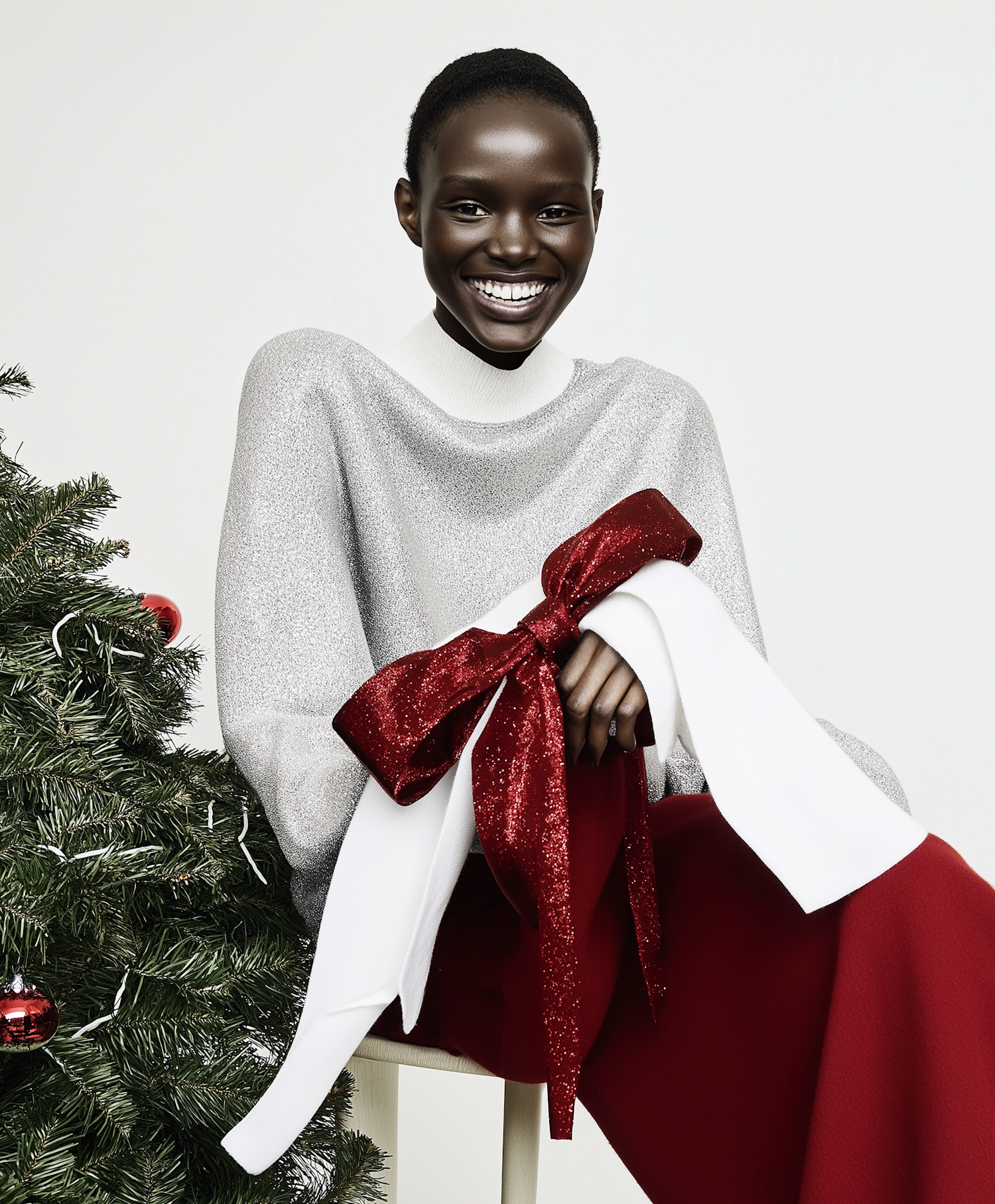 Smiling woman in silver top with red bow, sitting by a Christmas tree. Festive and elegant holiday scene.