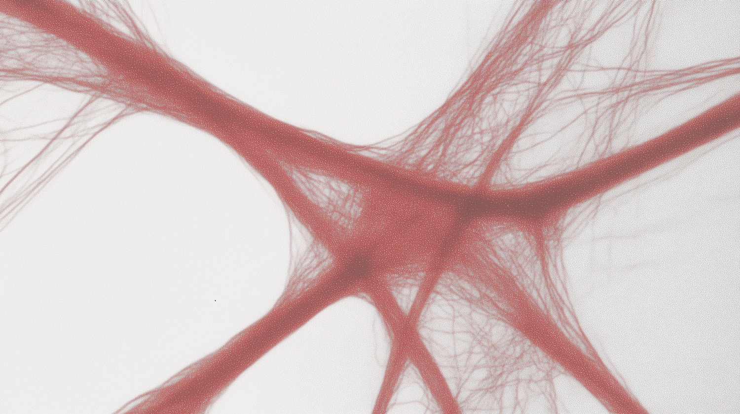 Close-up of red fibrous structures forming an intricate web-like pattern on a white background, resembling organic or biological networks.