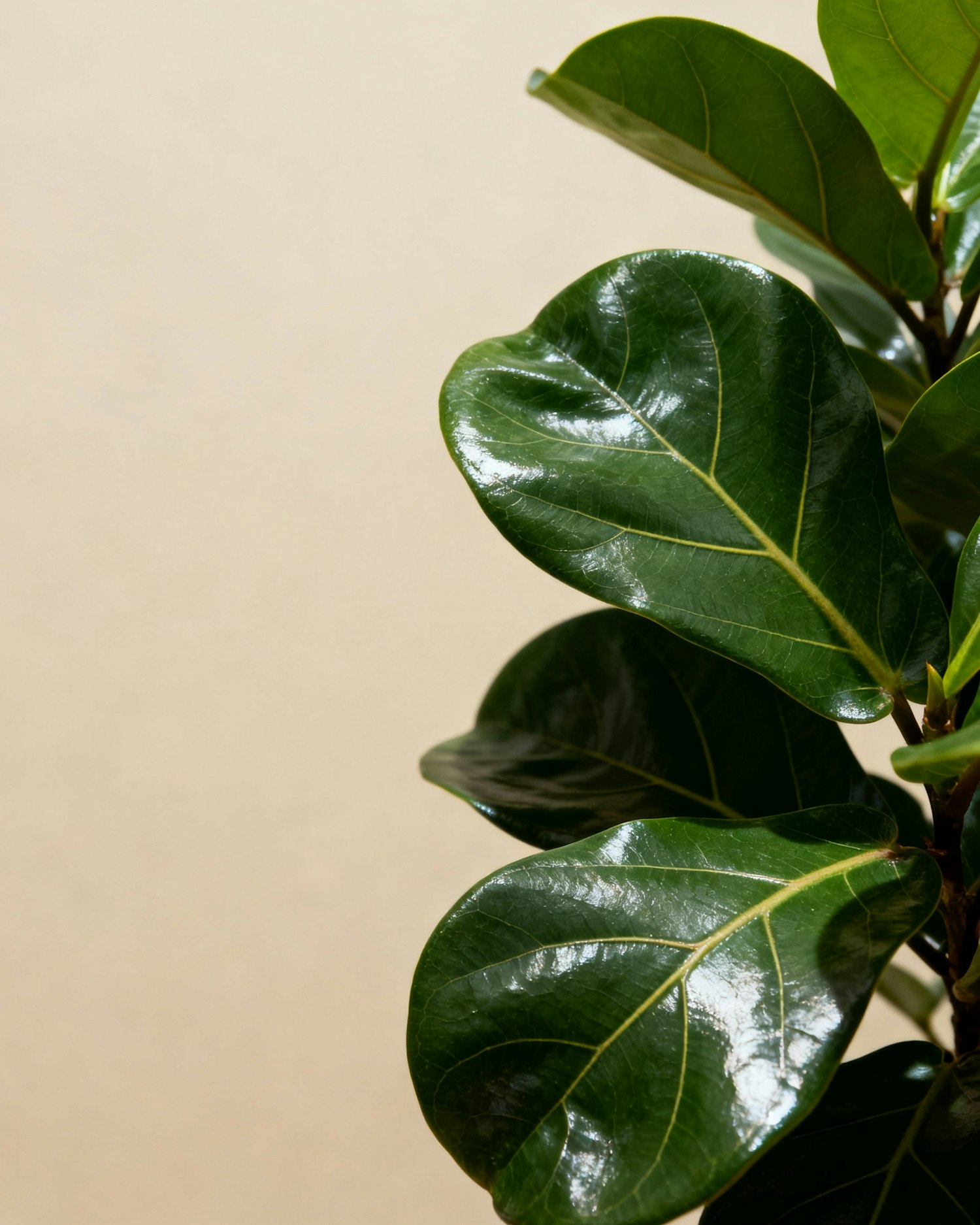 Close-up of a fiddle-leaf fig plant with glossy green leaves against a beige background, showcasing its natural beauty and vibrant texture.