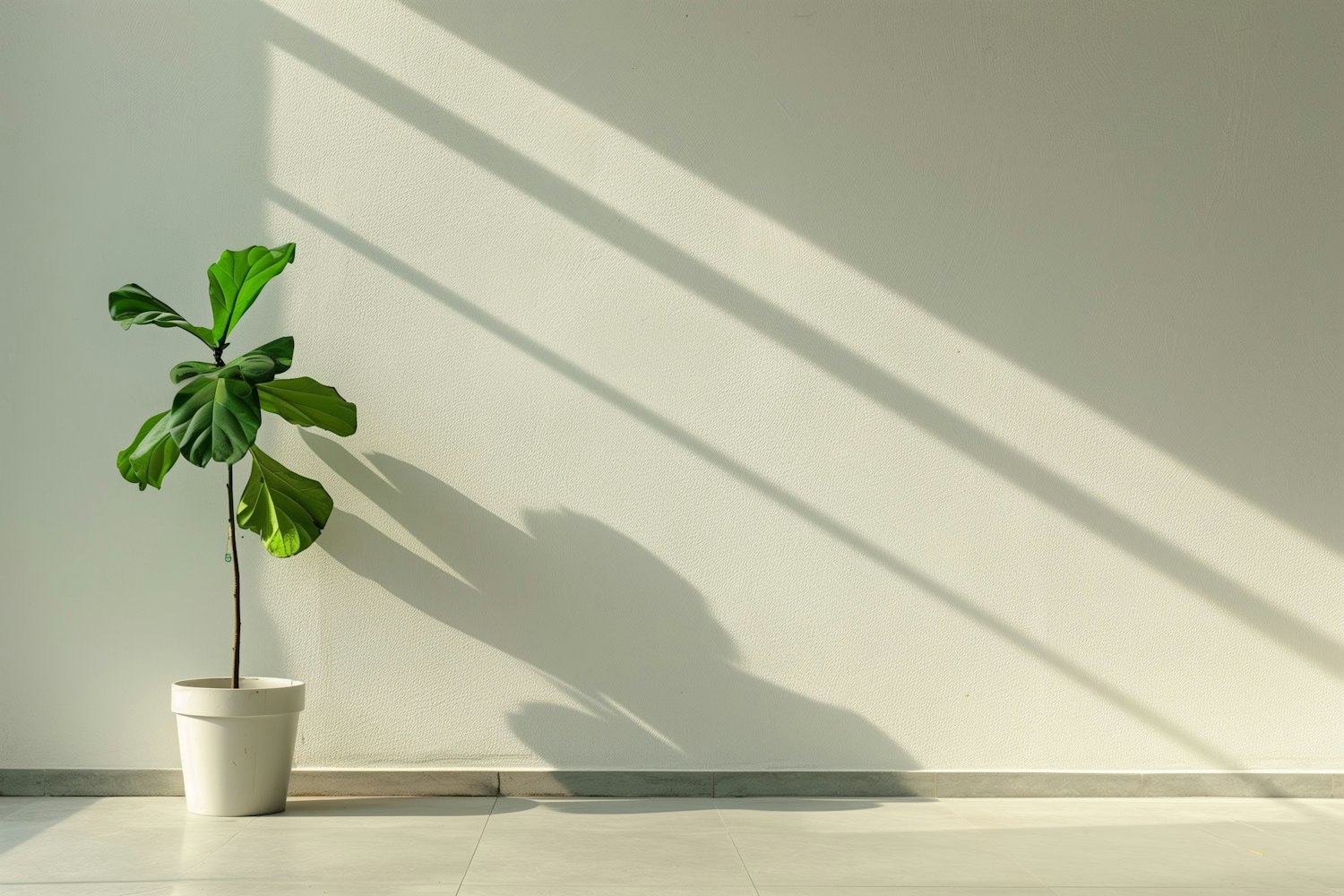 Minimalist fiddle-leaf fig plant in a white pot with sunlight casting shadows on a neutral wall, creating a serene and modern vibe.