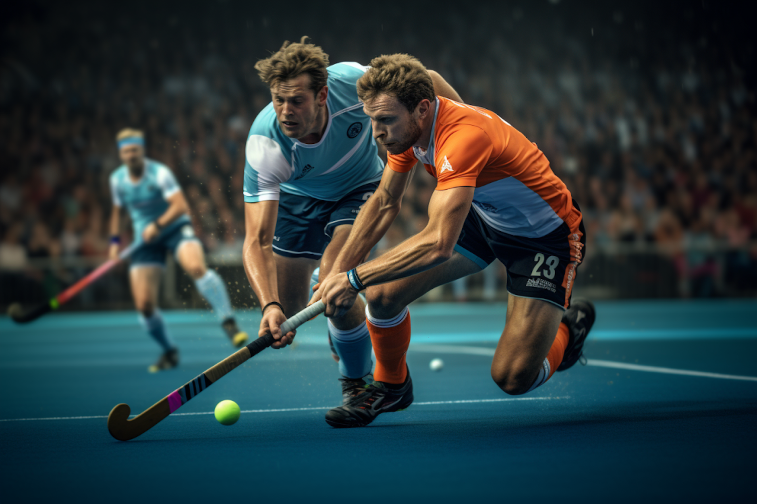 Intense field hockey match with players in action on a vibrant blue field, showcasing dynamic energy and competitive spirit.