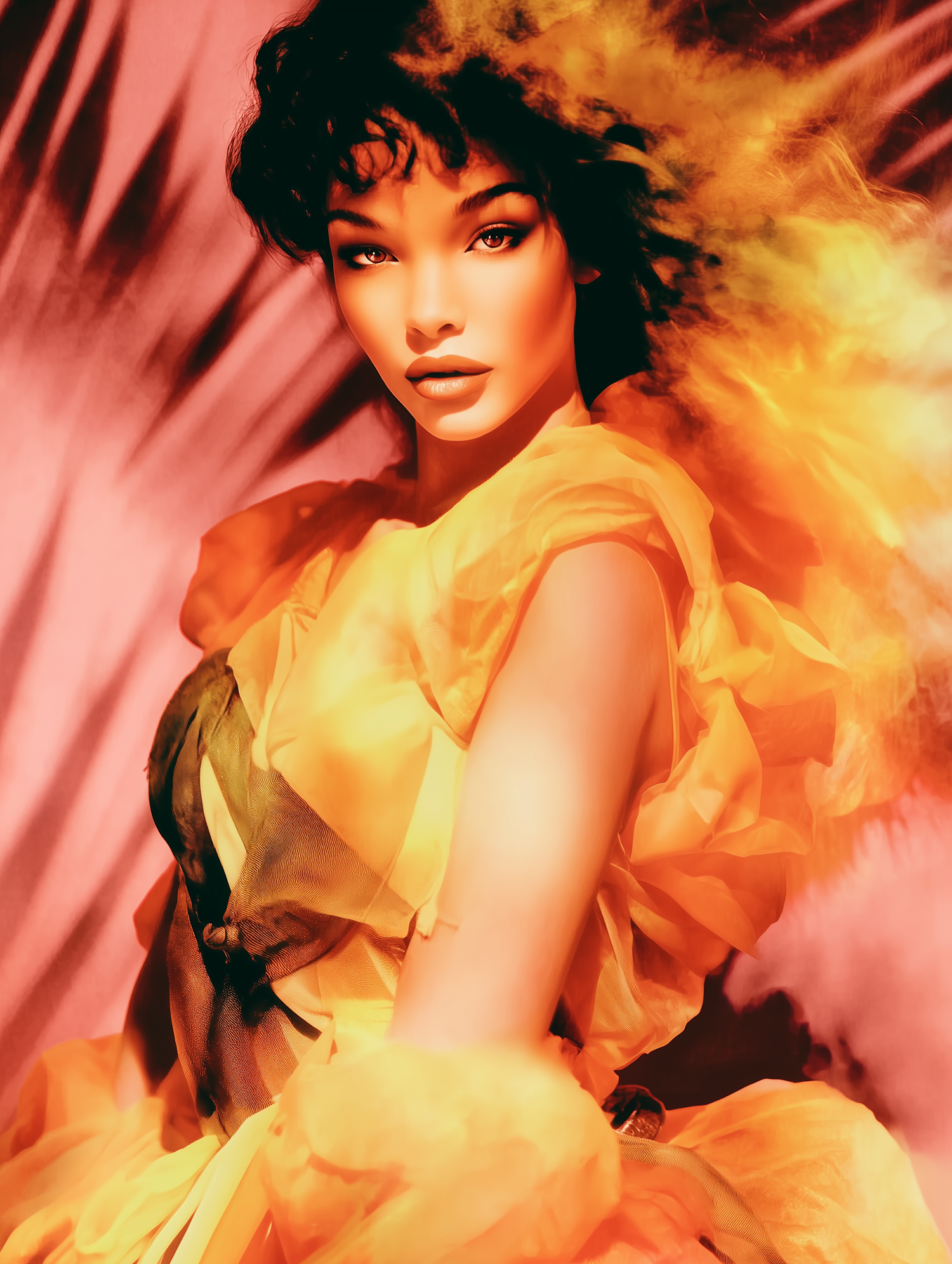 A vibrant portrait of a woman in flowing orange and yellow attire, with dynamic lighting and a captivating gaze.