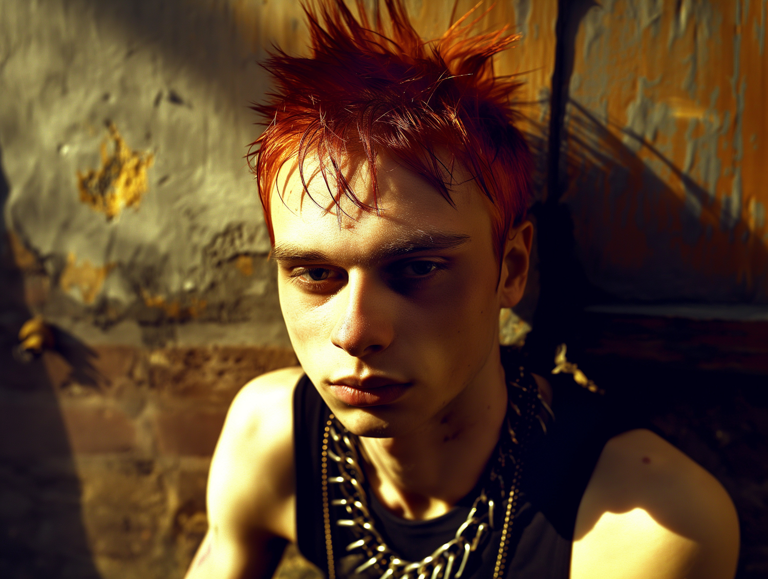 Young man with red spiky hair and chain necklace against a textured wall, dramatic lighting highlights his edgy style.