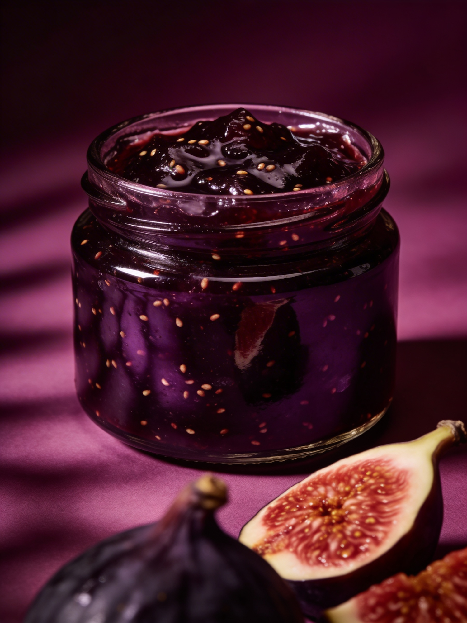 Dark fig jam with visible seeds in a jar against a plum‑purple backdrop. Rich tones, sculptural highlights, medium‑format clarity.
