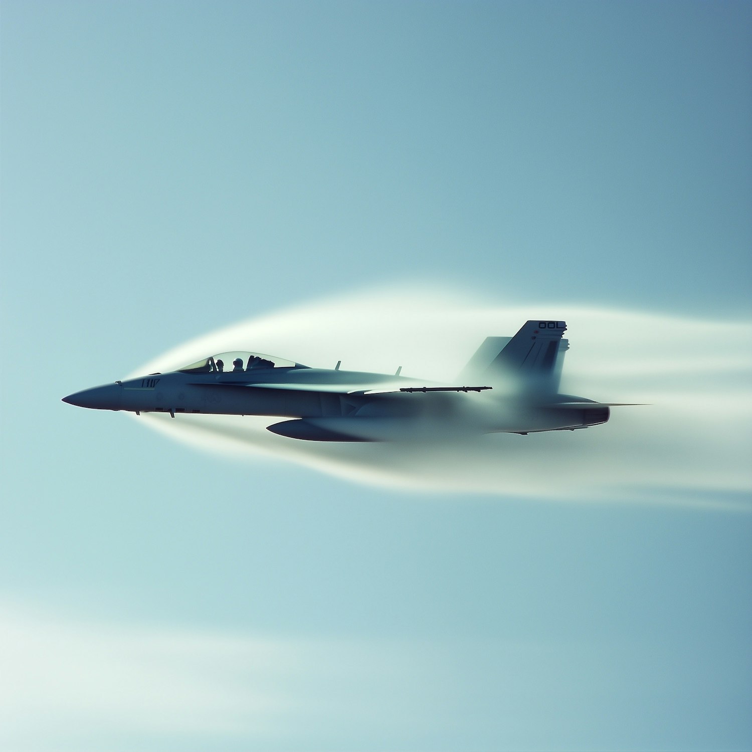 A fighter jet creates a stunning vapor cone as it speeds through a clear blue sky, showcasing the power of supersonic flight.
