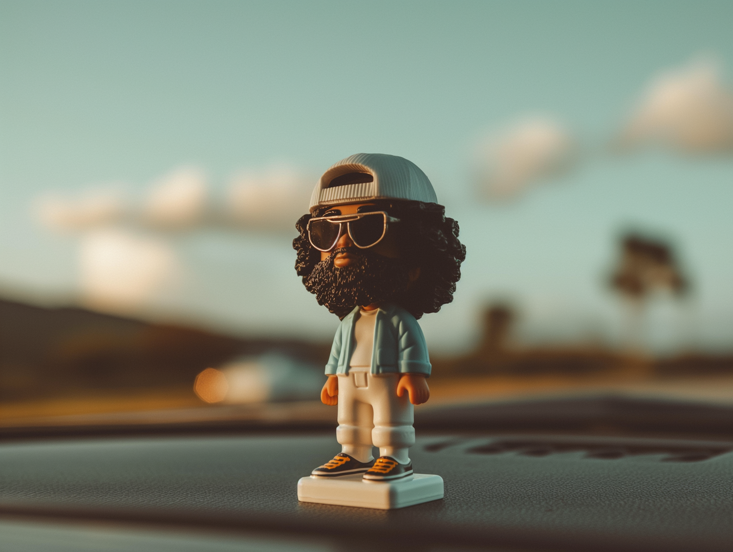 Bobblehead with curly hair, sunglasses, and cap on car dashboard. Warm lighting and blurred scenic background create a relaxed vibe.