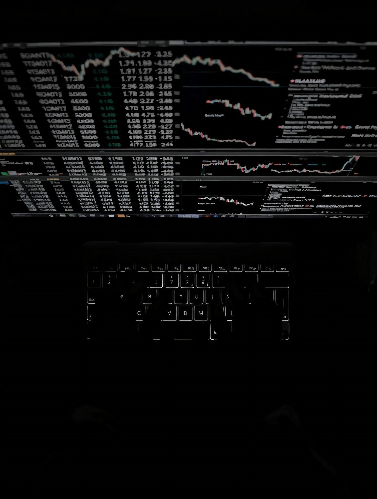 A dark scene with a glowing screen showing stock market data and a backlit keyboard, creating a focused and analytical atmosphere.
