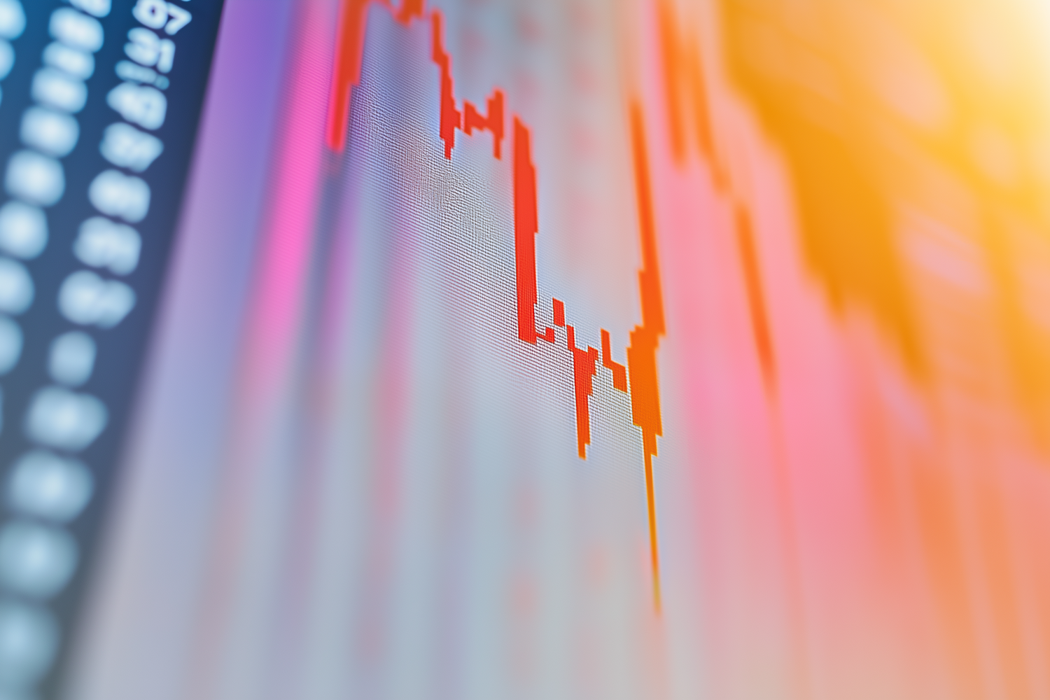Close-up of a financial chart with a red downward trend line on a gradient background, symbolizing market decline or volatility.