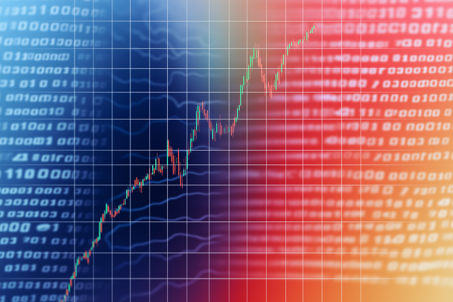 Dynamic financial chart with upward trend, binary code background, and blue-to-red gradient, symbolizing market growth and technology.