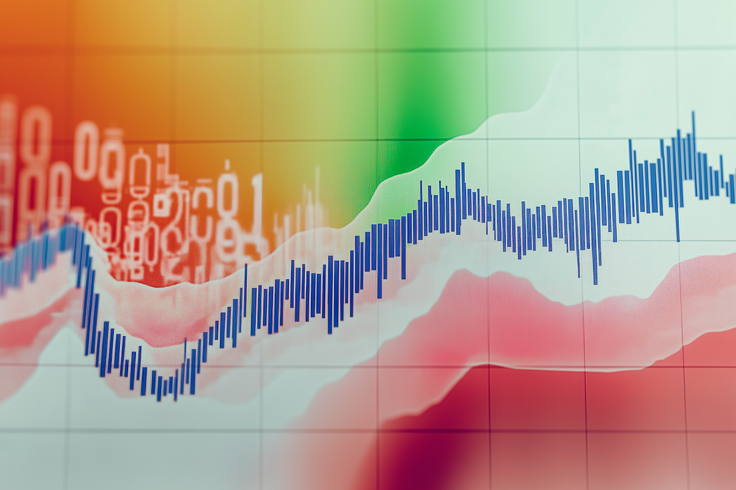 Colorful financial chart with candlestick graph, gradient background, and volatility bands, symbolizing market trends and analysis.