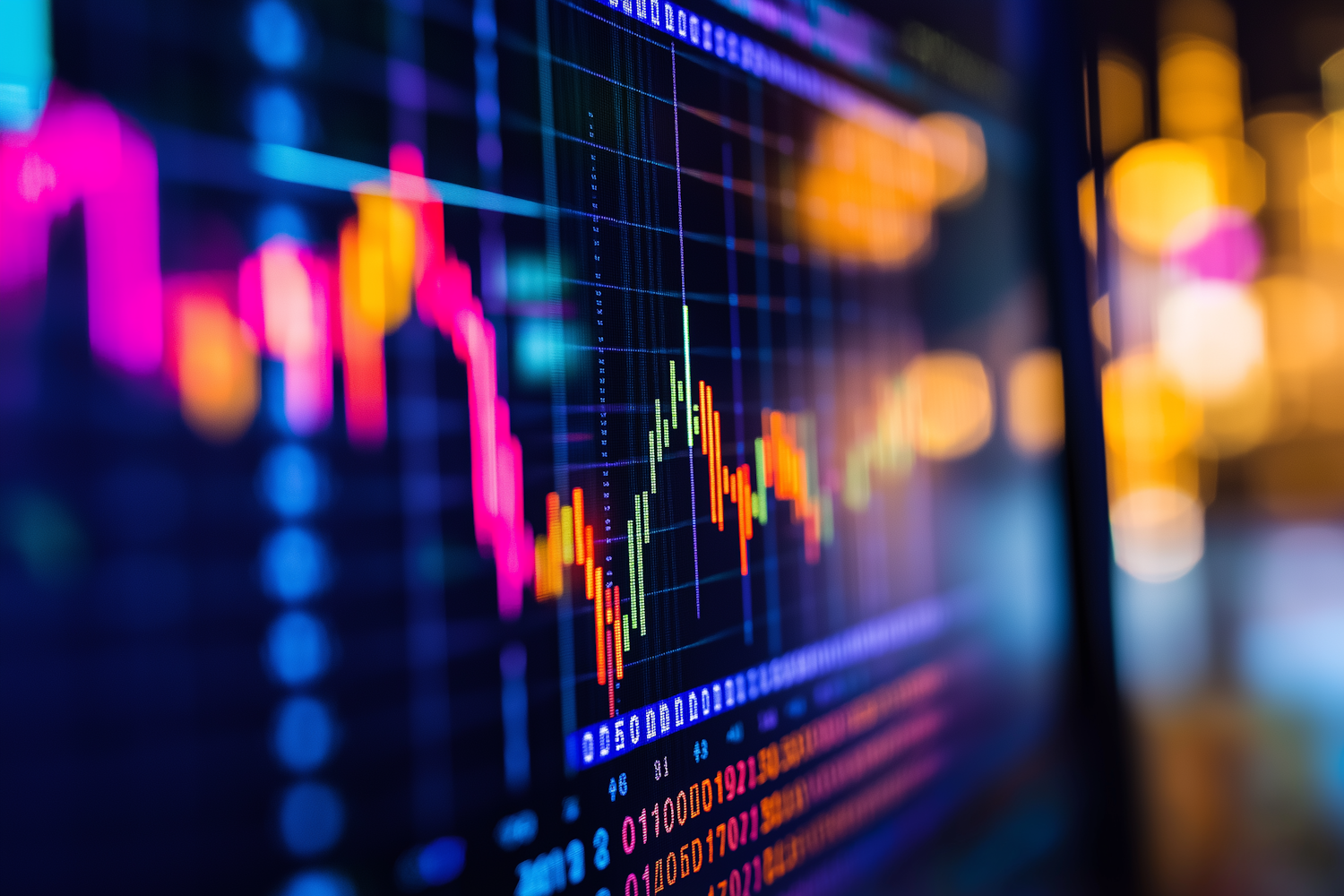 Close-up of a colorful financial trading chart with candlestick patterns and numerical data, set against a blurred bokeh background.