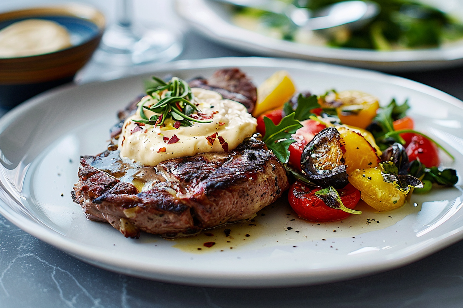 Grilled steak with creamy sauce and roasted vegetables on a white plate, garnished with herbs and pepper flakes.