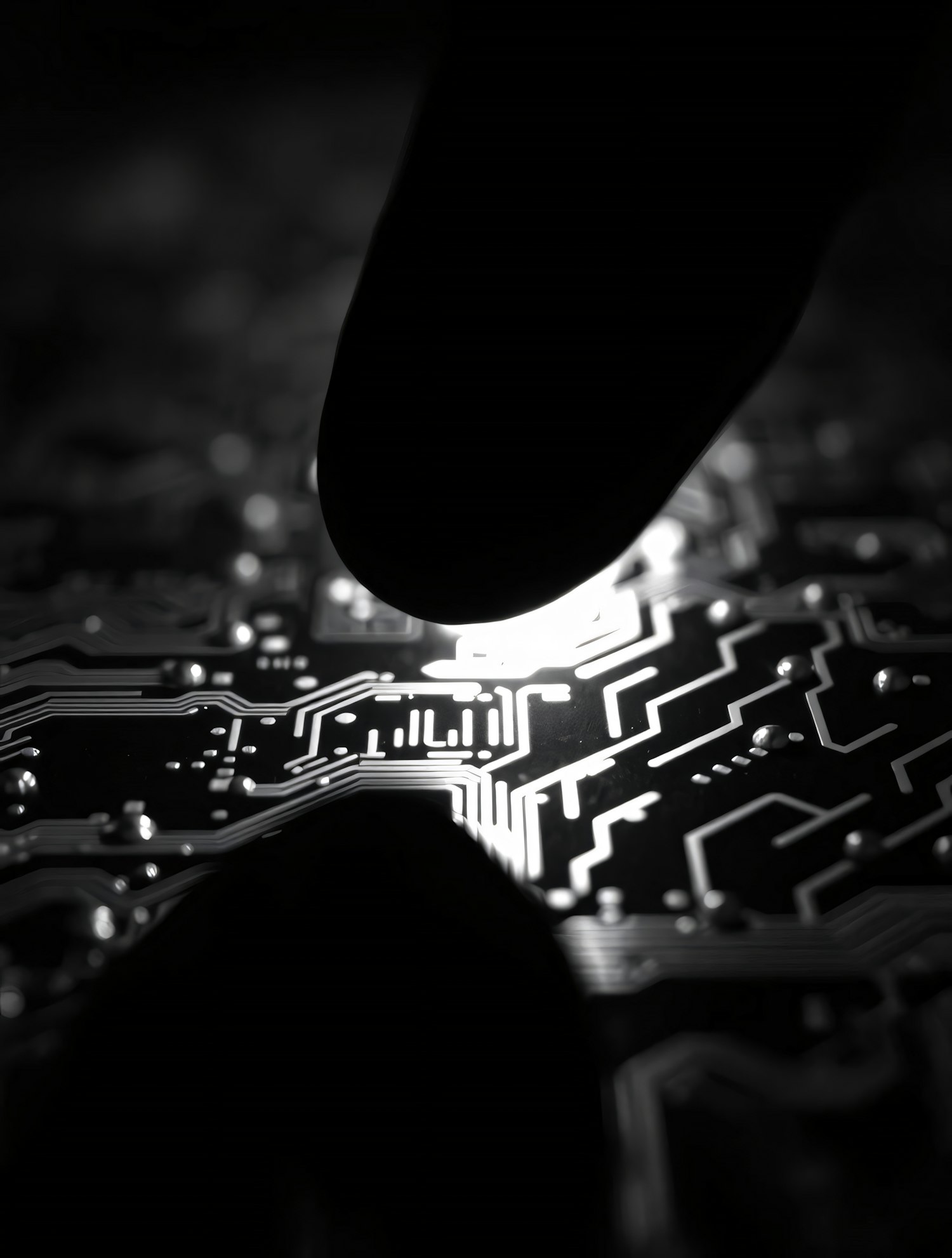 A black-and-white close-up of a finger touching a circuit board, highlighting the intricate pathways and reflective metallic surface.