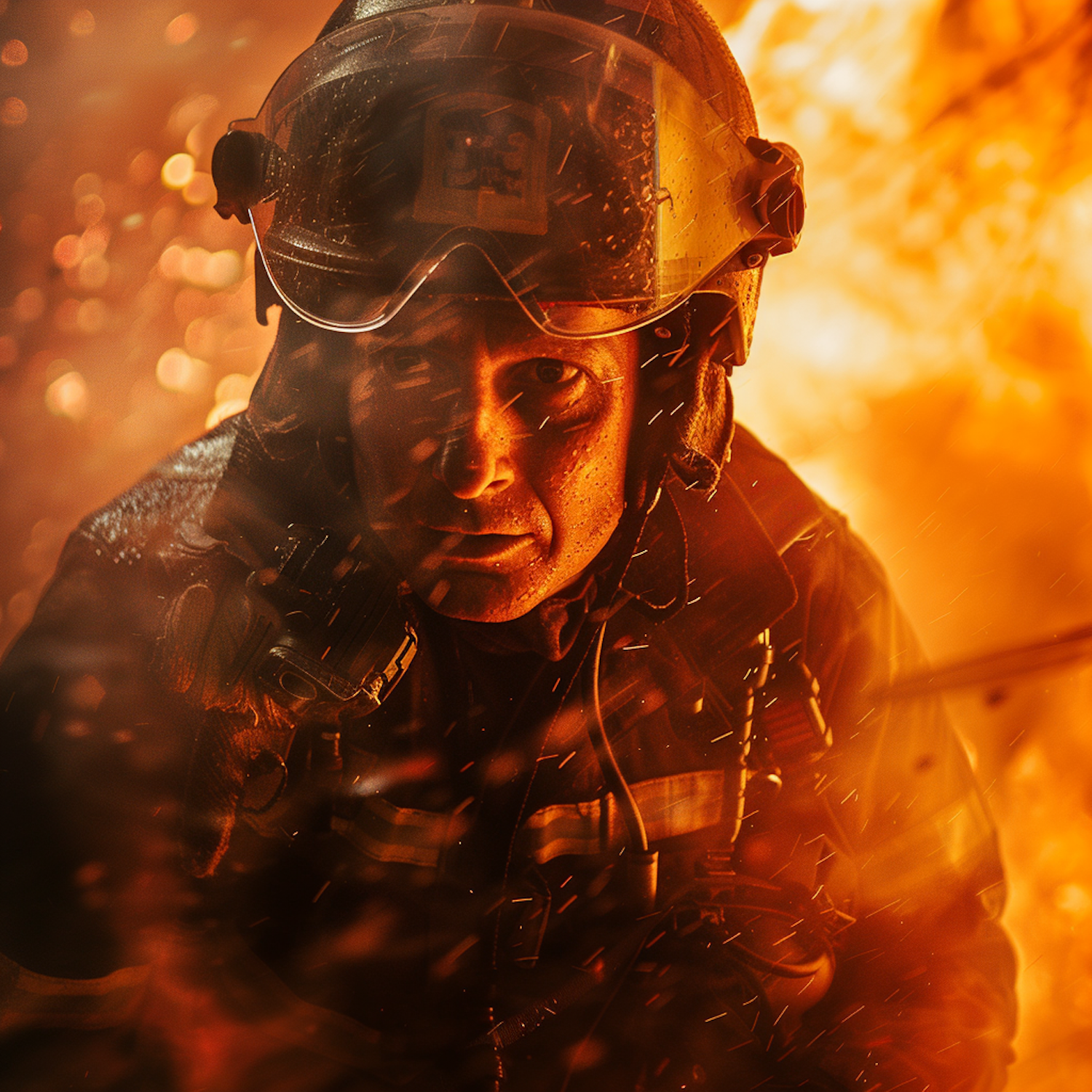A determined firefighter in action amidst intense flames, wearing protective gear and helmet, surrounded by sparks and embers.