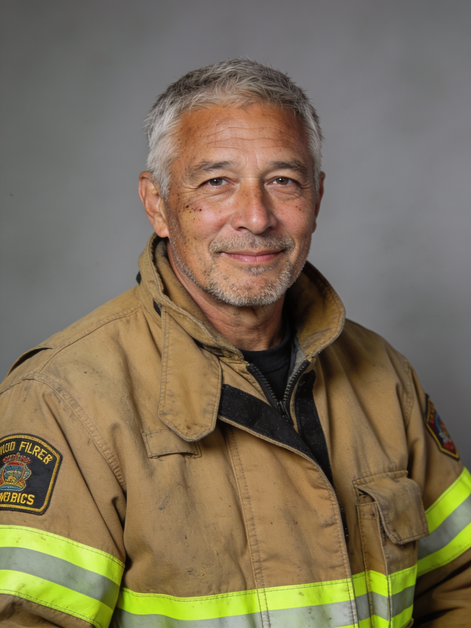 Portrait of a firefighter in a tan jacket with reflective stripes, showcasing a calm and confident demeanor against a neutral background.