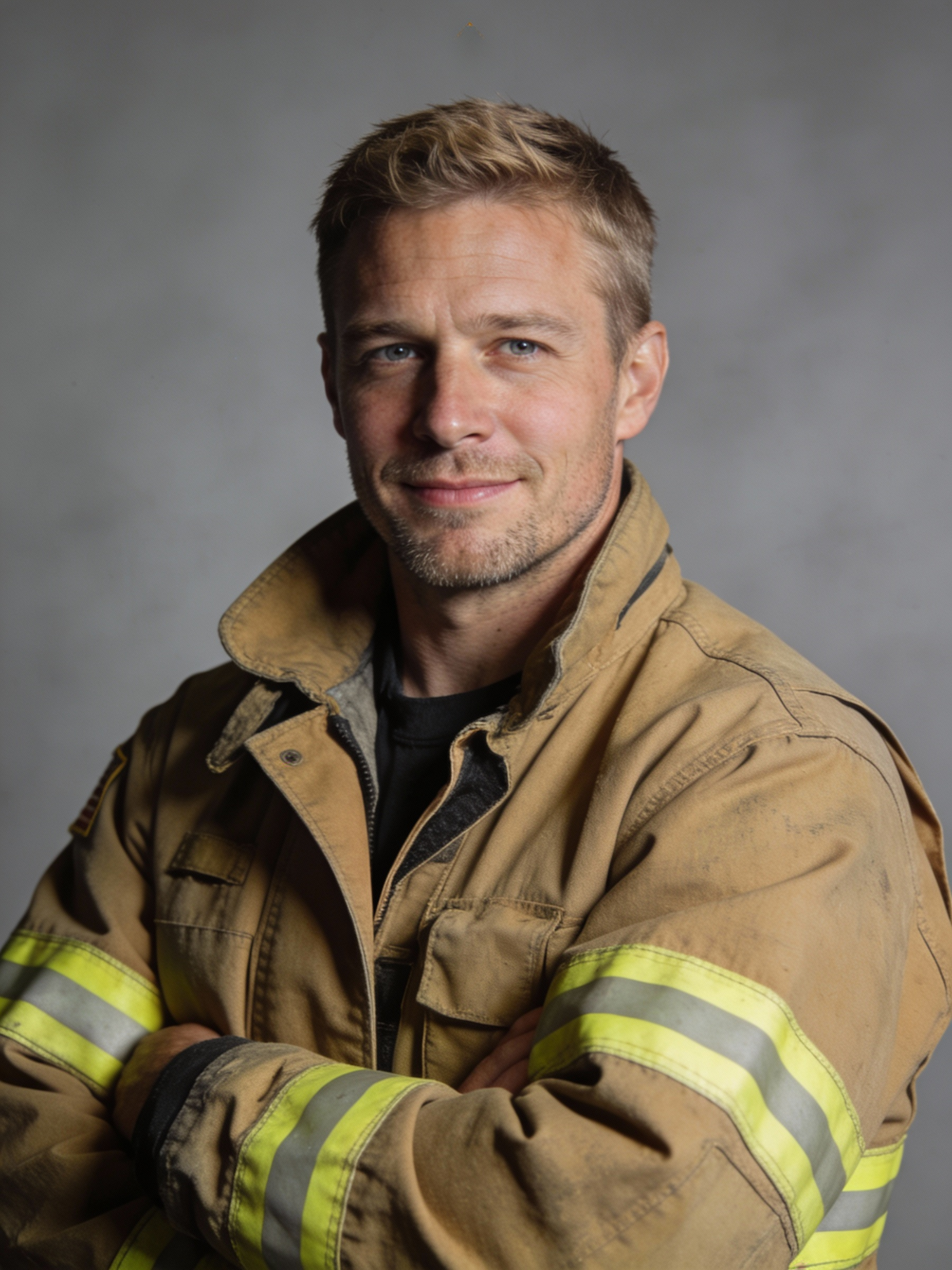 Studio portrait of a male firefighter, age 38; fair skin, cool undertone; short light brown hair; light stubble; wearing a tan firefighting turnout jacket with reflective stripes, collar slightly open, no visible branding; arms loosely crossed at chest level. Neutral mid-gray seamless backdrop; Rembrandt lighting with soft fill; 105 mm macro-sharp. Expression: serious but approachable, small closed-mouth smile with relaxed brow. Framing: portrait orientation, straight-on to camera, head-and-shoulders, full head and both shoulders fully inside the frame with a small space above the head, no cropping at the sides or top. Negative: brand logos, over-sharpening, neon color cast, visible text on patches.