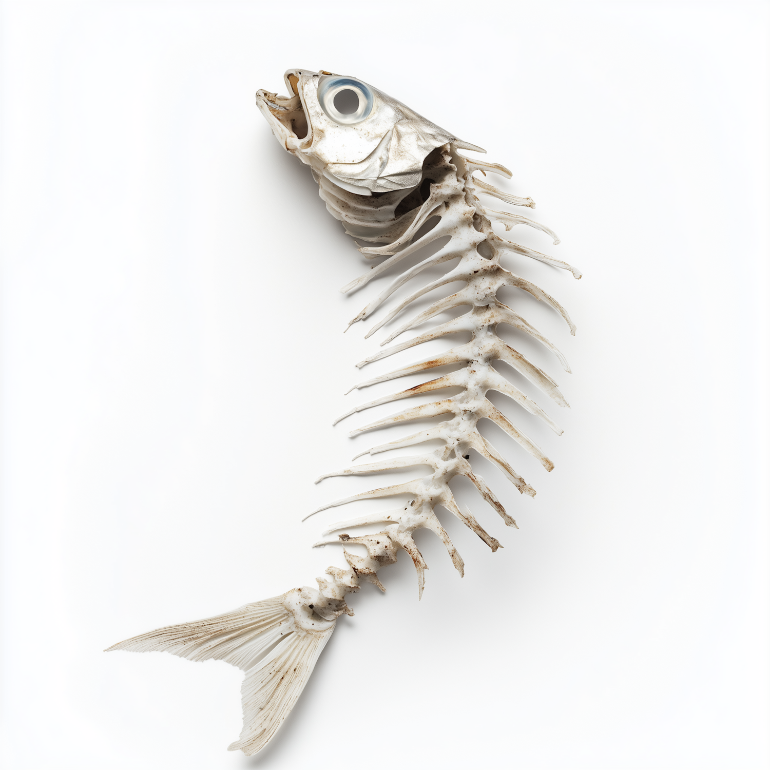 A detailed fish skeleton with head, spine, and tail fin displayed on a white background, highlighting its intricate structure.