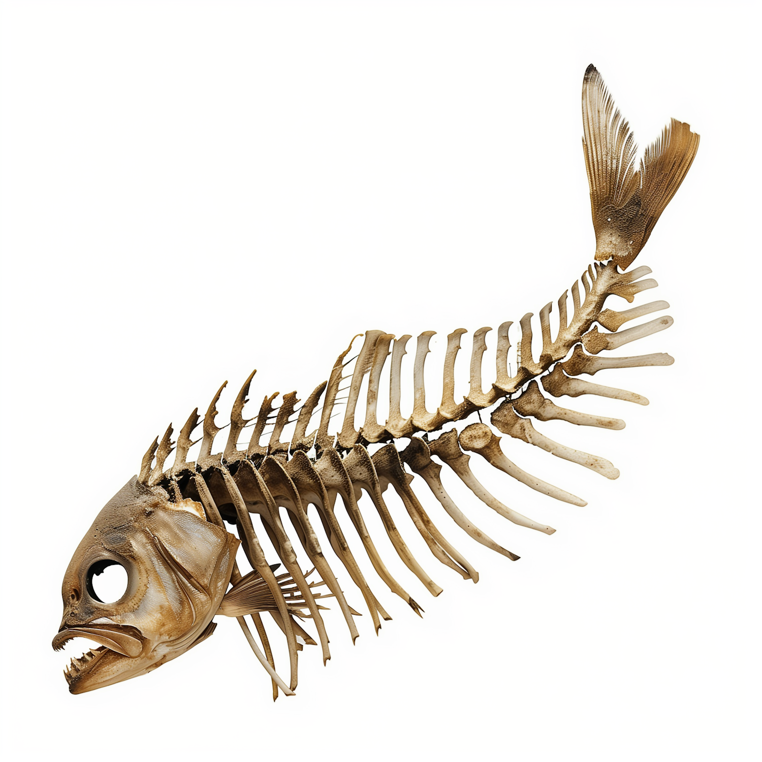 A close-up of a fish skeleton with intricate bone details, sharp teeth, and a translucent tail fin on a clean white background.