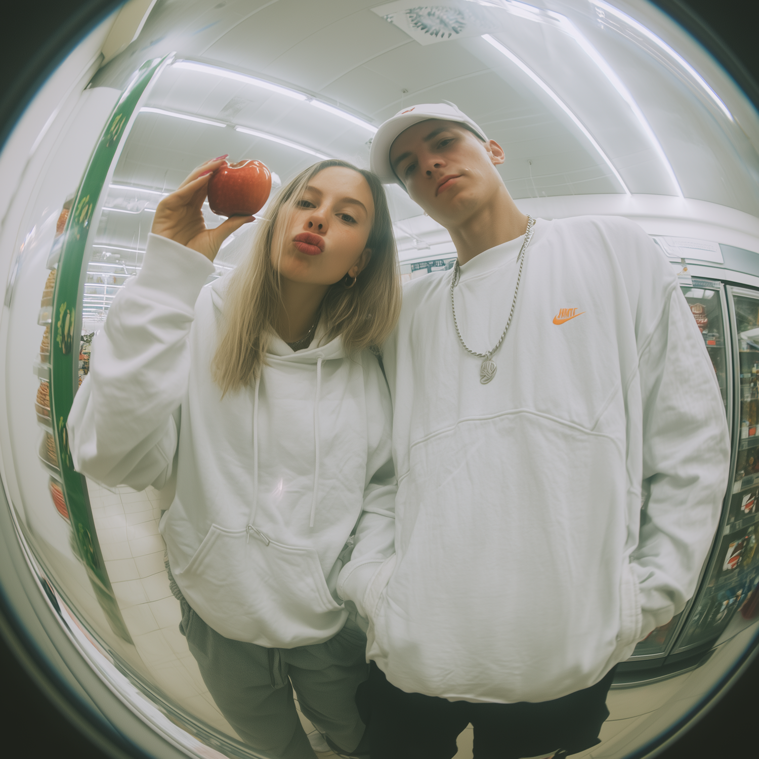 Two stylish individuals in white hoodies pose playfully in a store, with one holding a red apple. Captured with a fisheye lens for a fun effect.