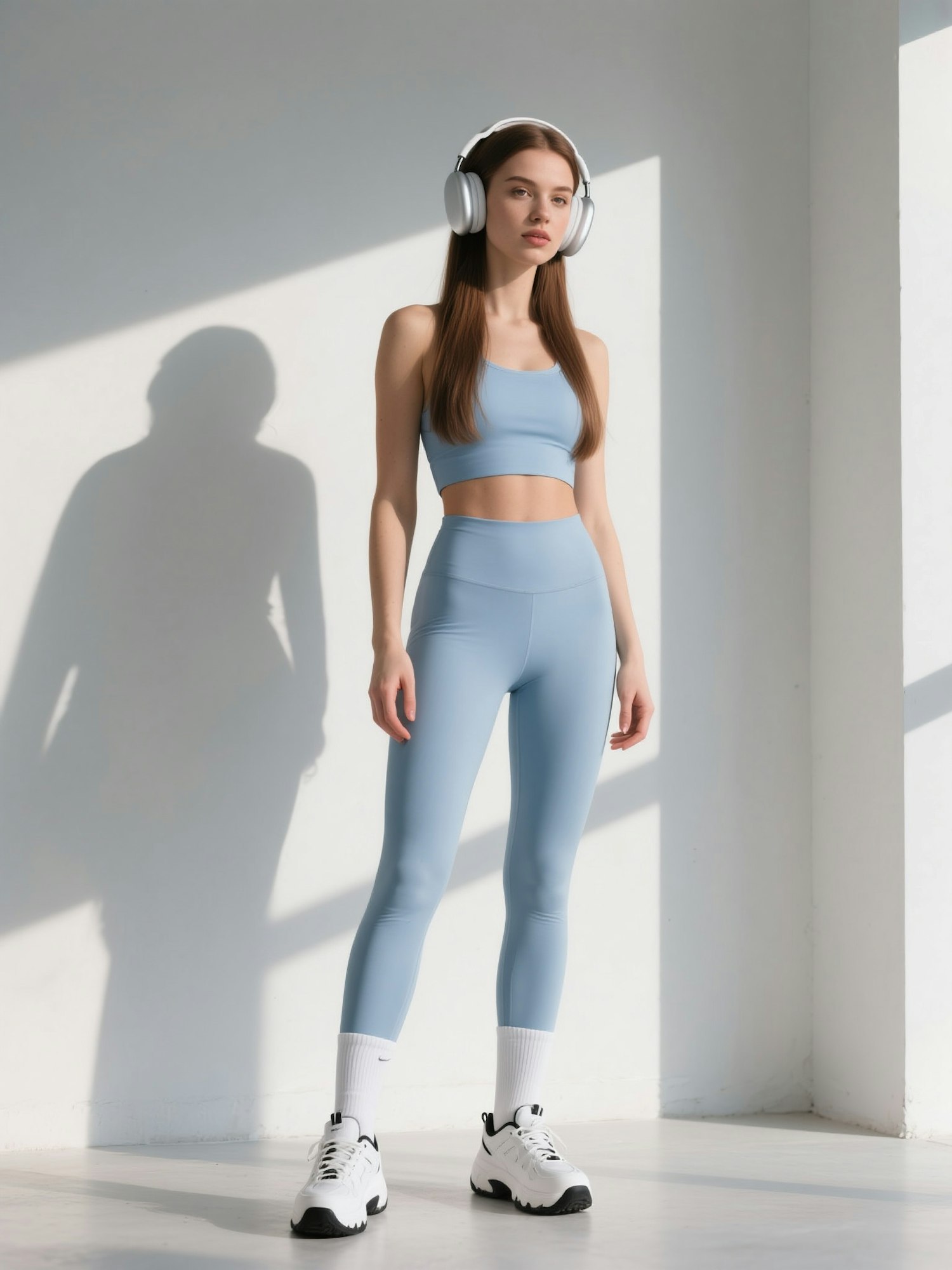 highly realistic full-body photo, daylight. A young slim caucasian woman with long straight brown hair, light tan skin, wearing a seamless light blue fitted crop top and matching high-waisted leggings. Large white headphones on her ears. White chunky sneakers with black details, white socks. Minimal modern white wall background, natural daylight shadows. Editorial sporty influencer style.