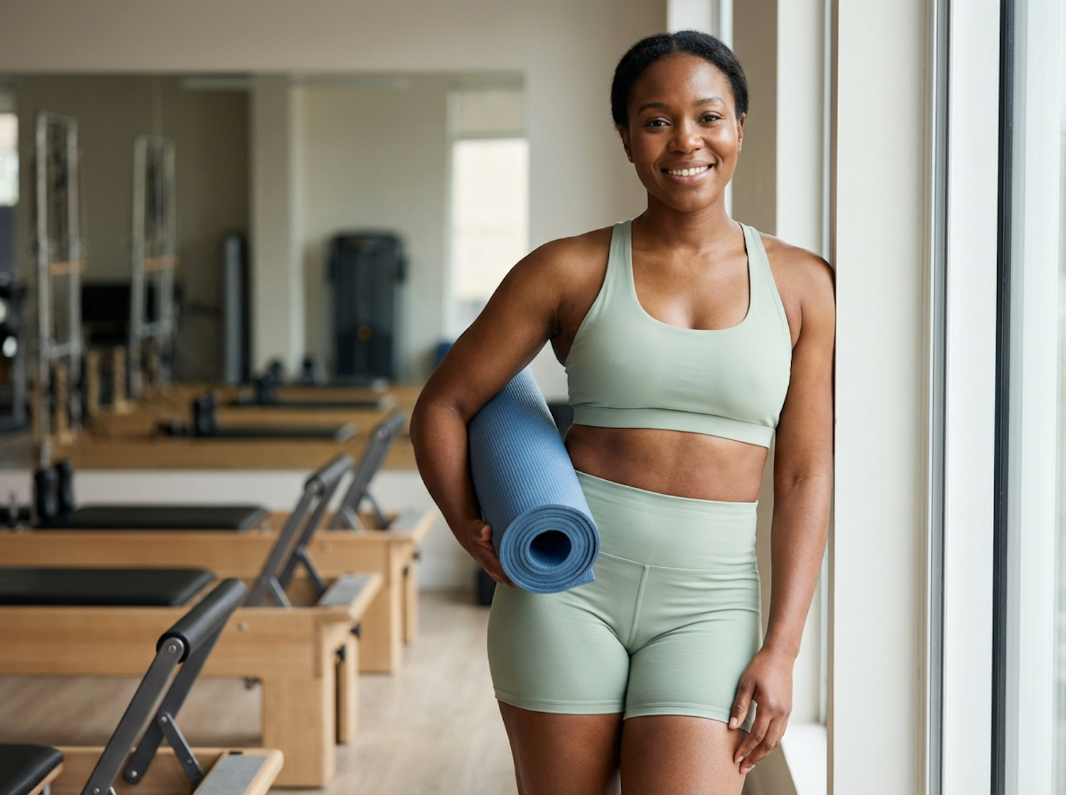 A woman in a fitness studio holding a yoga mat, dressed in light green activewear, with exercise equipment in the background.