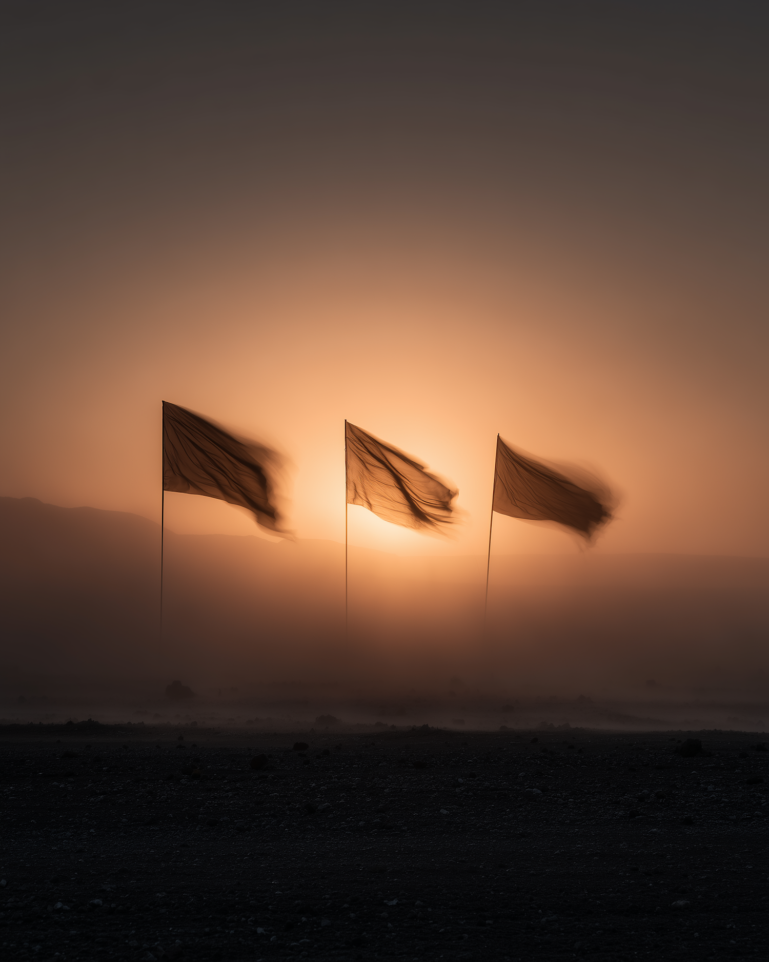 Three flags silhouetted against a glowing sunset, their fabric flowing in the wind, creating a serene and dramatic scene.