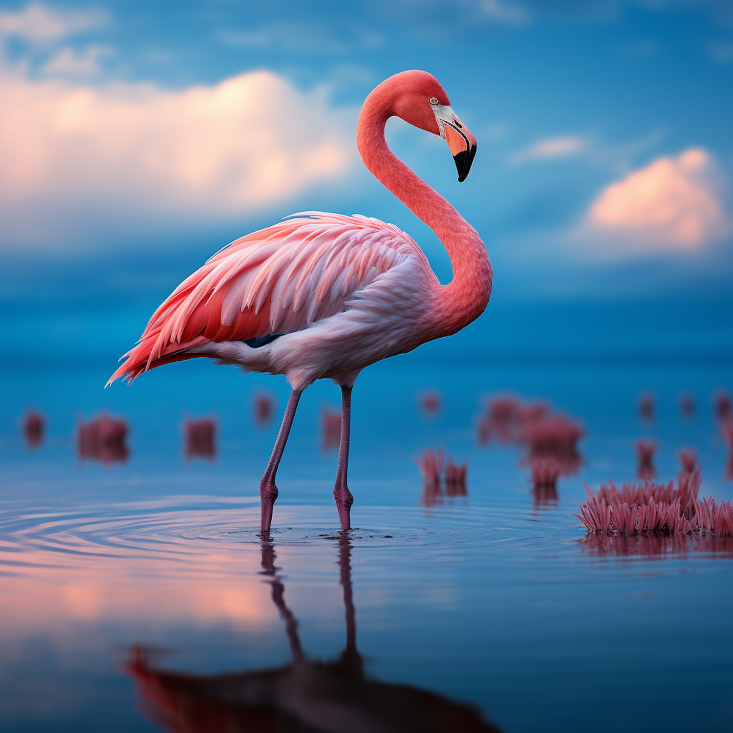 A stunning pink flamingo stands in serene blue waters, reflecting its elegant form. Soft clouds and pink plants enhance the tranquil scene.