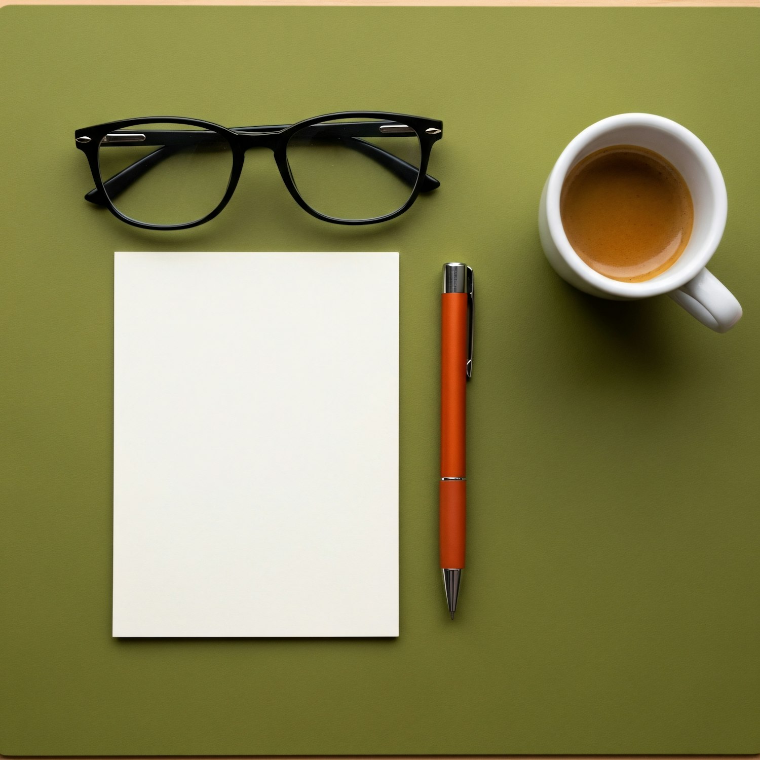 Flat lay of glasses, a blank notepad, an orange pen, and a cup of espresso on a green surface, perfect for a productivity theme.