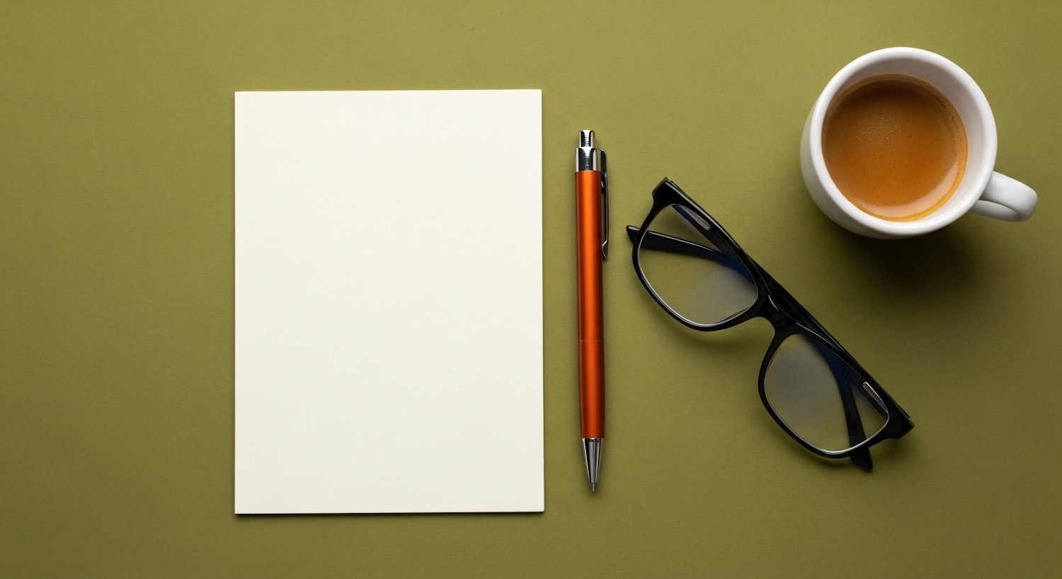 Flat lay of a blank paper, orange pen, black glasses, and a cup of espresso on a green background, perfect for productivity themes.