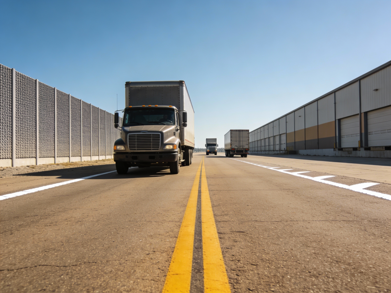Trucks driving on a wide road beside a warehouse and a tall wall, under a clear blue sky, showcasing industrial transportation.