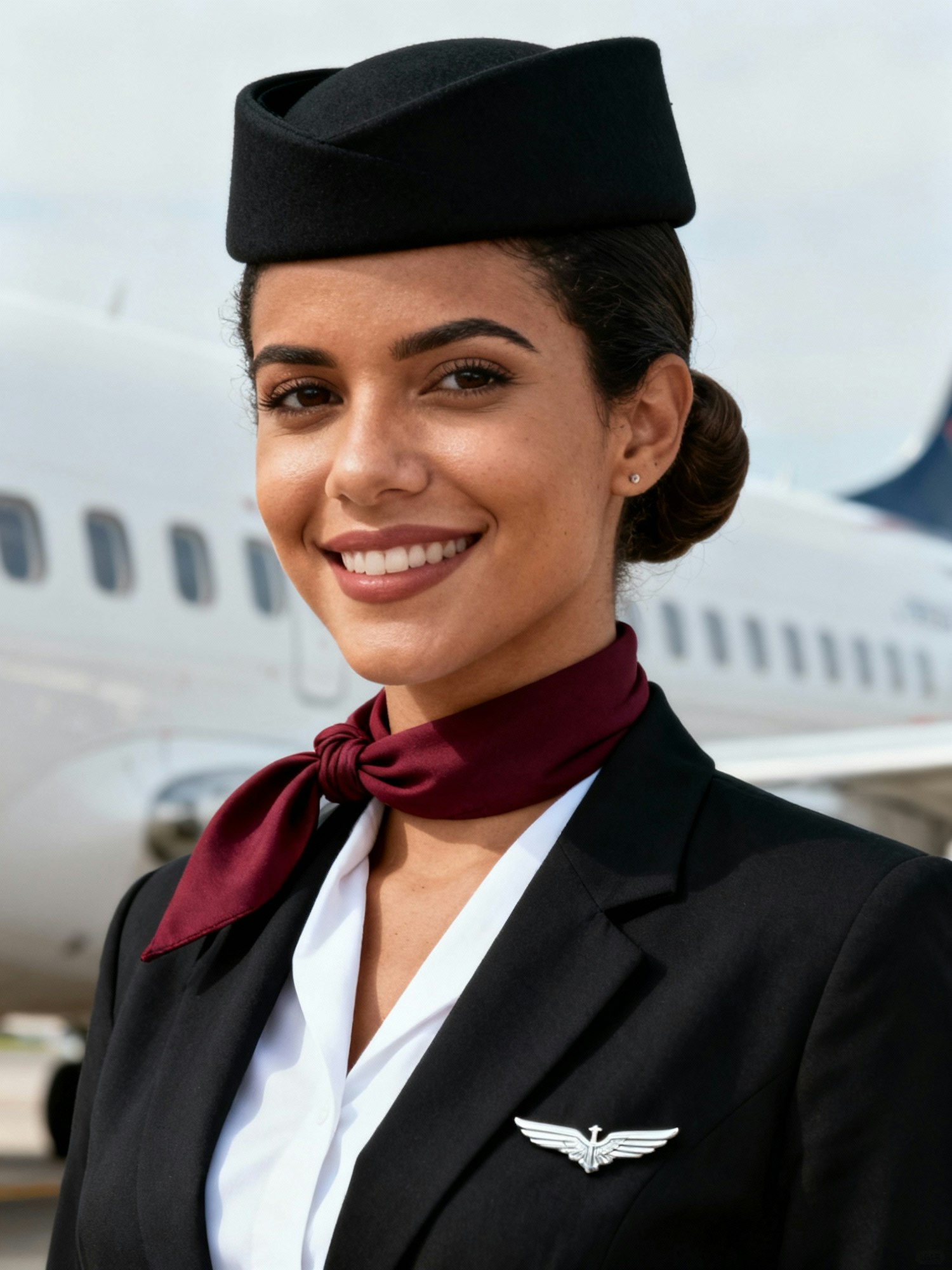 Outdoor airport portrait of a Brazilian woman cabin crew, 29; medium-light skin (warm); tidy chignon; black pillbox hat (plain); burgundy neck scarf in a neat side knot; black jacket over white blouse, small silver wing pin (no logo). Pose: head upright (0–2° roll), chin parallel to floor, shoulders level and squared; eyes to camera; welcoming smile. Framing: head-and-shoulders (not tight), full hat visible with 10 % headroom; crop at upper chest; centered; 3:4 vertical. Background: “blurred commercial airliner fuselage with window line, no logos or tail numbers, same angle and distance.” Lighting: soft open-shade daylight. Lens/Optics: 105 mm at ~f/2.8; macro-sharp on eyes; neutral WB; exposure matched. Uniform rule: black jacket, white shirt, matte black tie; women also wear black pillbox hat + burgundy scarf. Negative: Dutch angle, over-contrast, HDR/glam retouch.