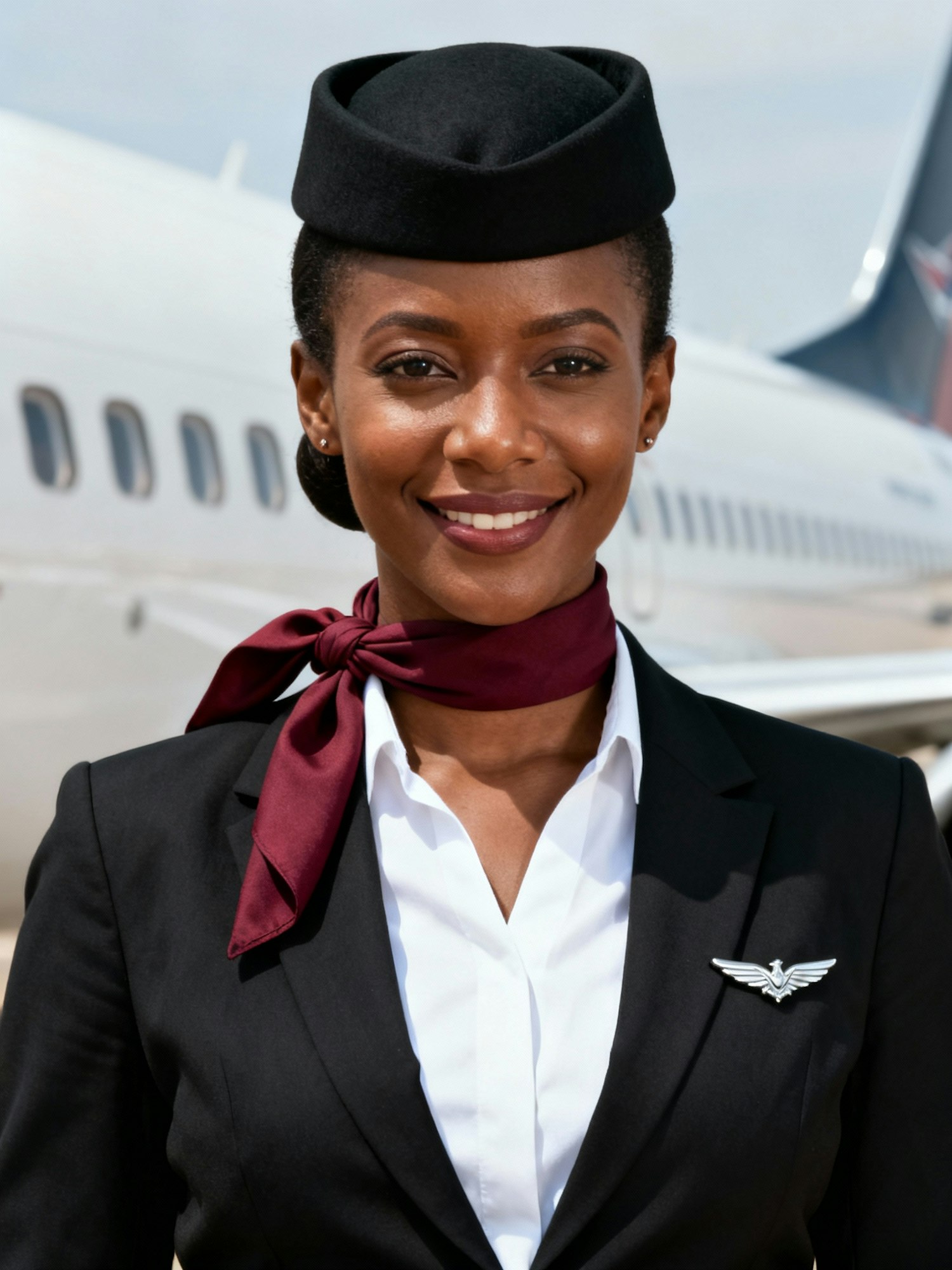 Outdoor airport portrait of a South African woman cabin crew, 32; dark brown skin (neutral); sleek low bun; black pillbox hat (plain); burgundy neck scarf in a neat side knot; black jacket over white blouse, small silver wing pin (no logo). Pose: head upright, chin parallel, shoulders level and squared; eyes to camera; poised, confident smile. Framing: head-and-shoulders (not tight), full hat visible with 10 % headroom; crop at upper chest; centered; 3:4 vertical. Background: “blurred commercial airliner fuselage with window line, no logos or tail numbers, same angle and distance.” Lighting: soft open-shade daylight; gentle highlight balance on skin. Lens/Optics: 105 mm at ~f/2.8; macro-sharp on eyes; neutral WB; exposure matched. Uniform rule: black jacket, white shirt, ; women also wear black pillbox hat + burgundy scarf. Negative: color cast, blown highlights, head tilt.