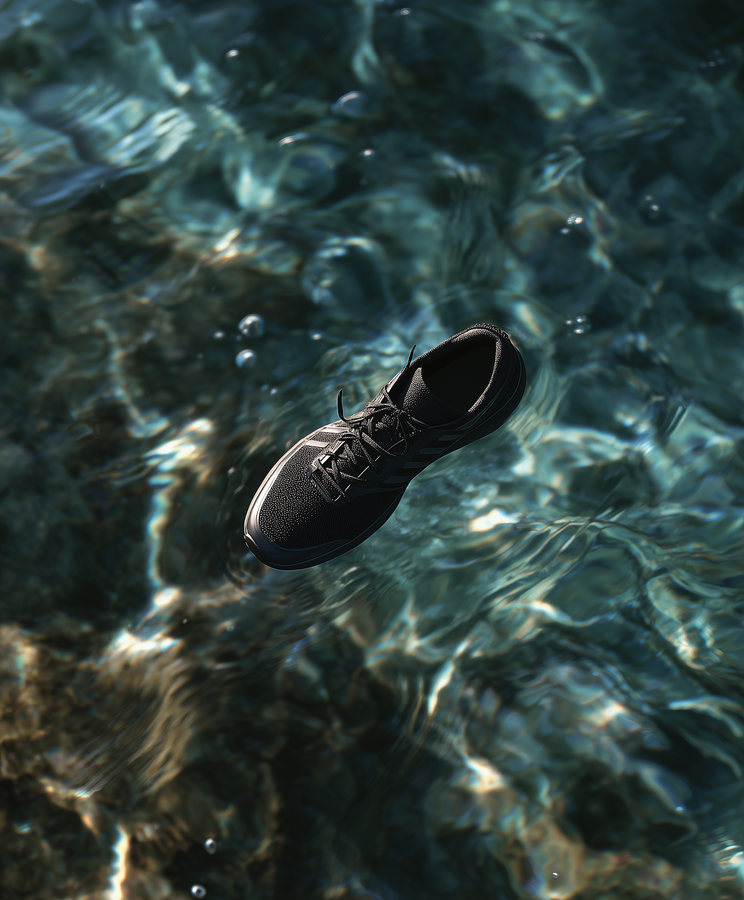 A black athletic shoe floating on clear, rippling water with sunlight reflections creating a dynamic and vibrant scene.
