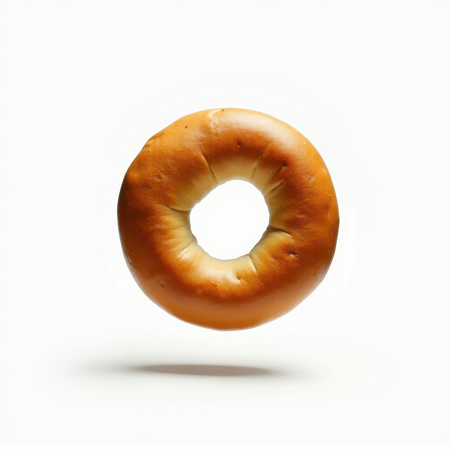 A golden-brown bagel floating against a white background, showcasing its perfect round shape and smooth texture.