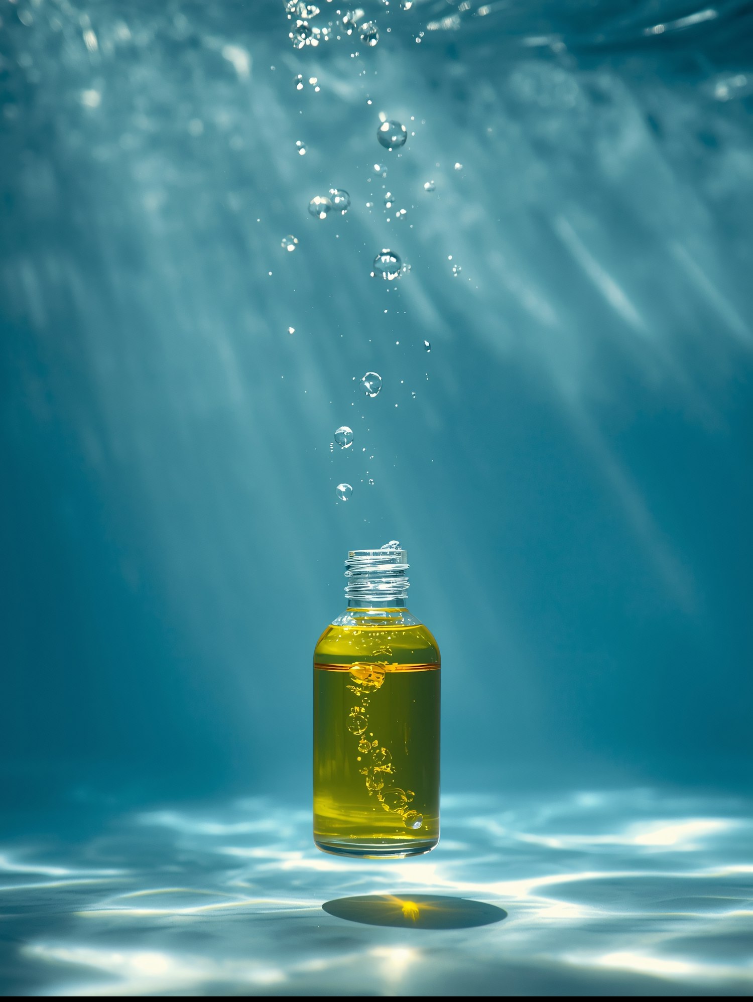 A small bottle of yellow liquid floats underwater, surrounded by bubbles and illuminated by sunlight filtering through the water.
