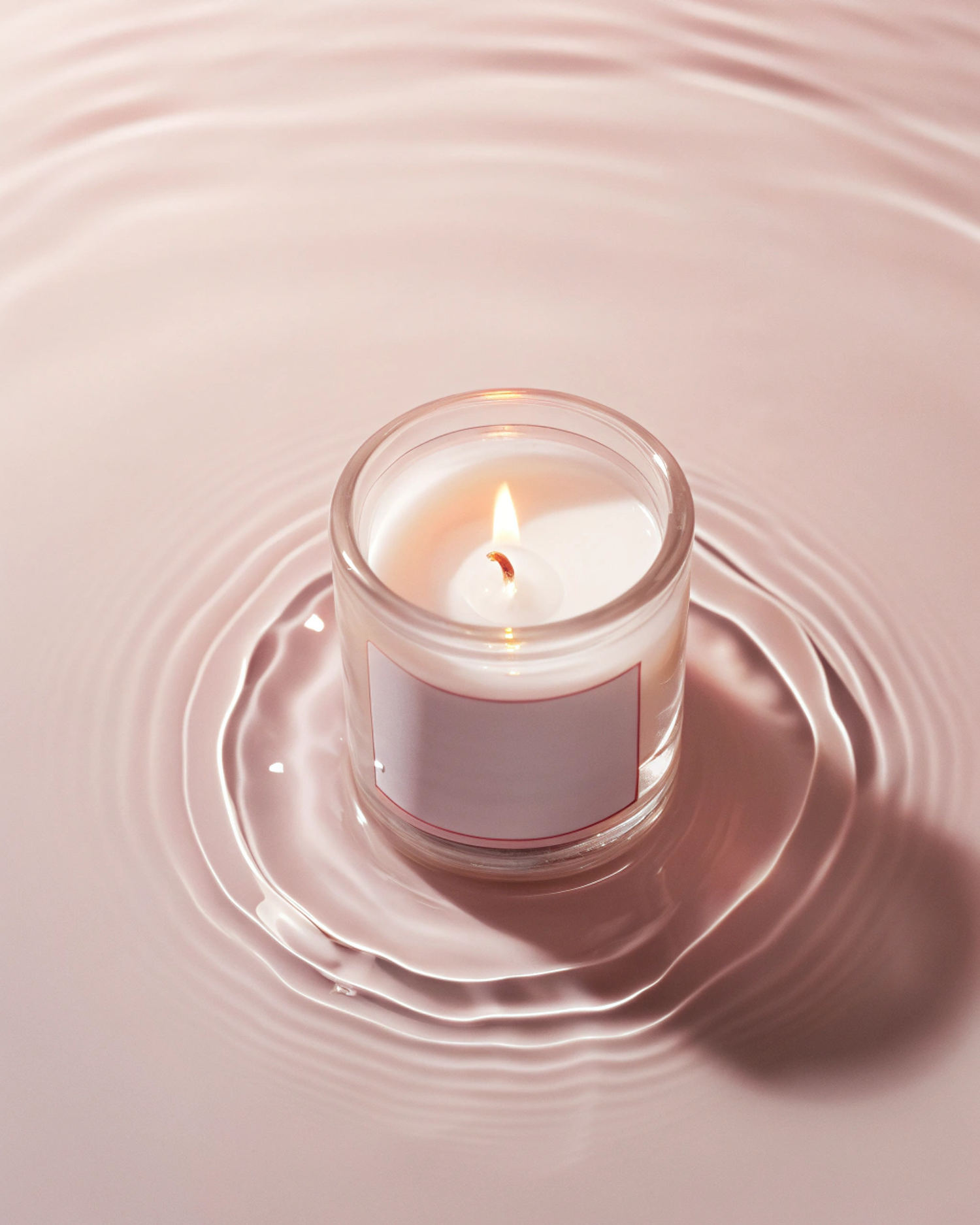 A lit white candle in a glass holder floats on rippling water, creating a serene and calming atmosphere with soft pink hues.