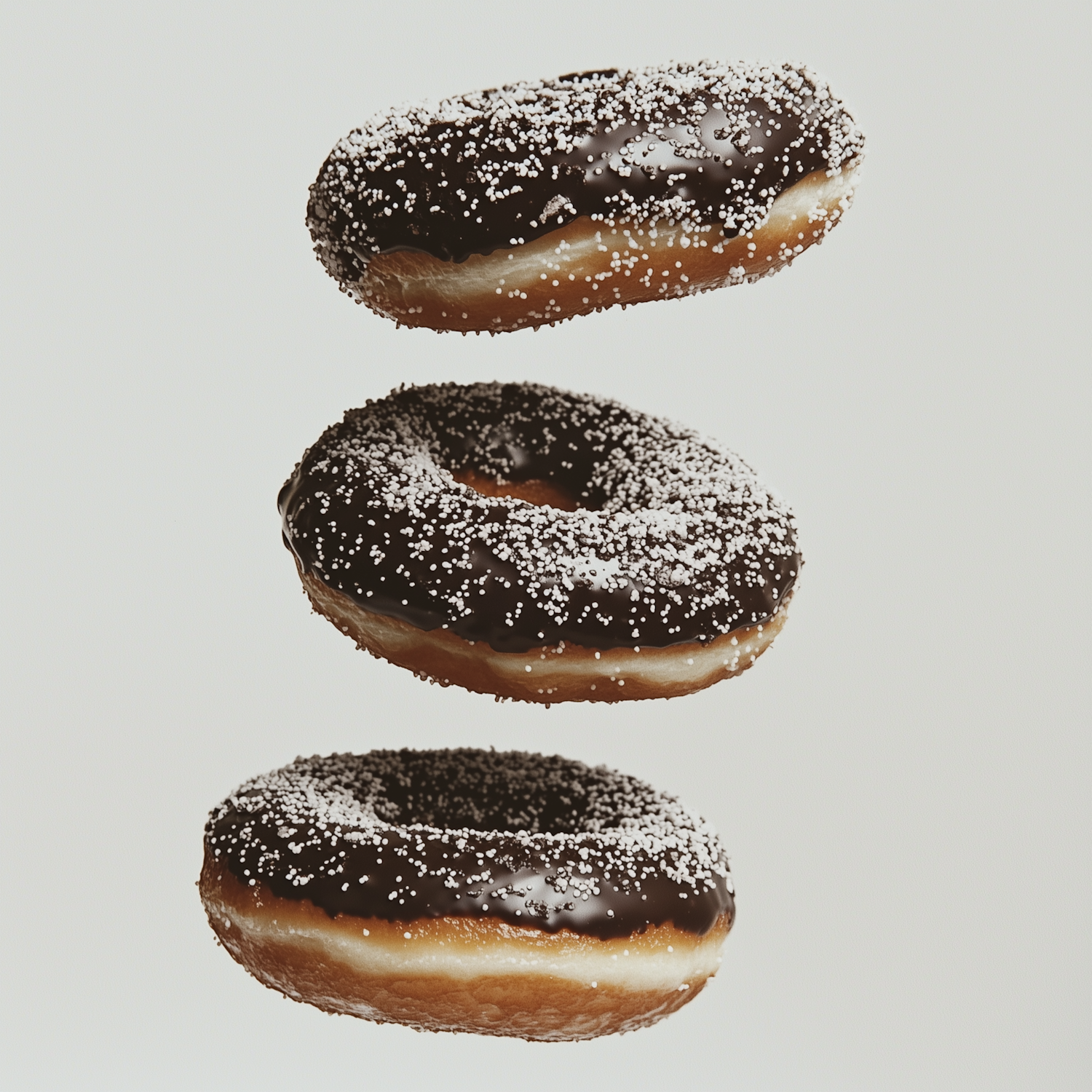 Three chocolate-glazed donuts with sugar sprinkles float against a plain background, showcasing their glossy texture and golden-brown base.