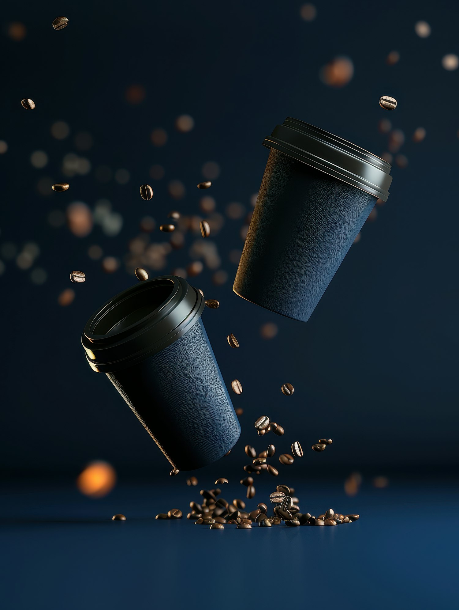Dynamic image of two floating coffee cups with scattered coffee beans against a dark, blurred background, creating a lively scene.