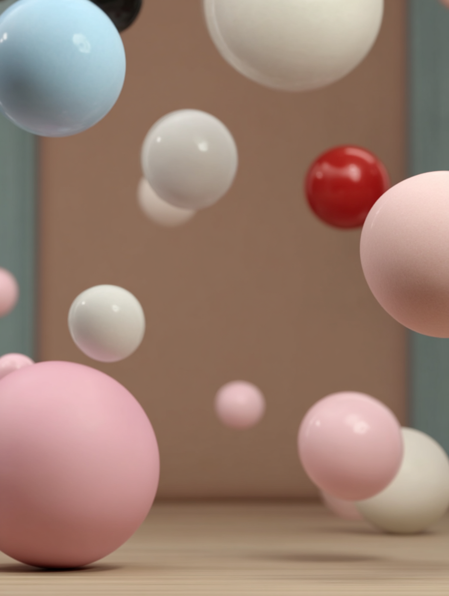Floating pastel and vibrant spheres in a soft beige and teal setting, creating a dreamy, weightless aesthetic with glossy textures.