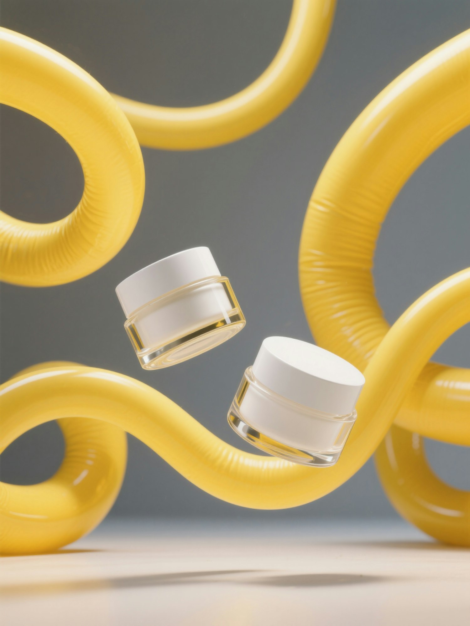 Floating cosmetic jars with white lids and transparent bodies, set against a backdrop of vibrant yellow loops and a neutral gradient.